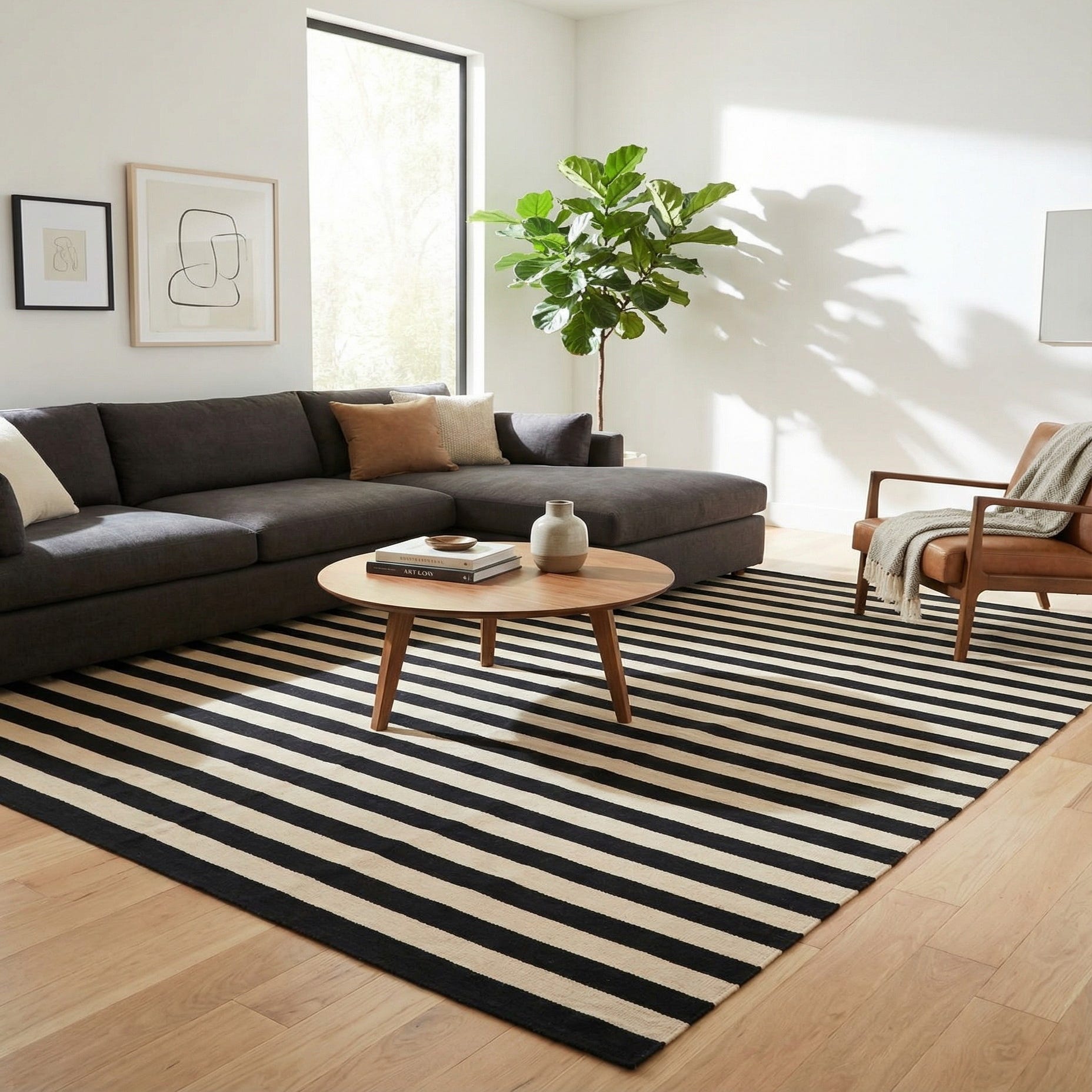 A 7x10 rectangular flatweave rug with bold black and cream horizontal stripes, suitable for a modern living room.