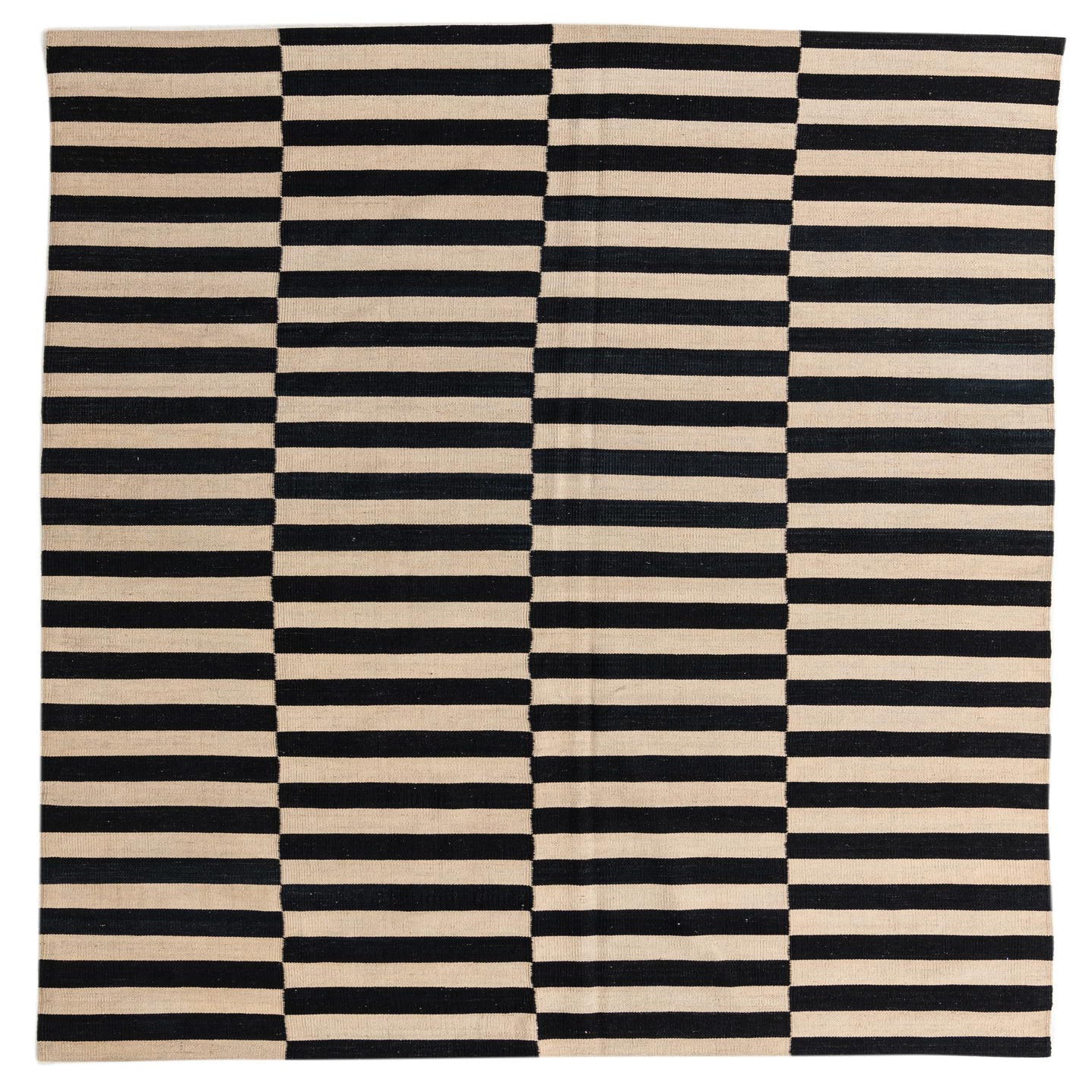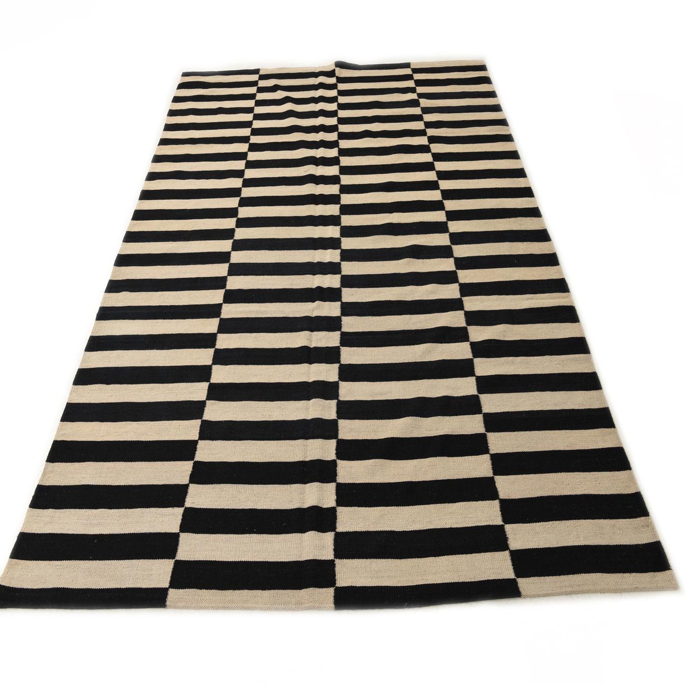 A 7x10 rectangular flatweave rug featuring a bold black and cream striped pattern, perfect for a modern living room.