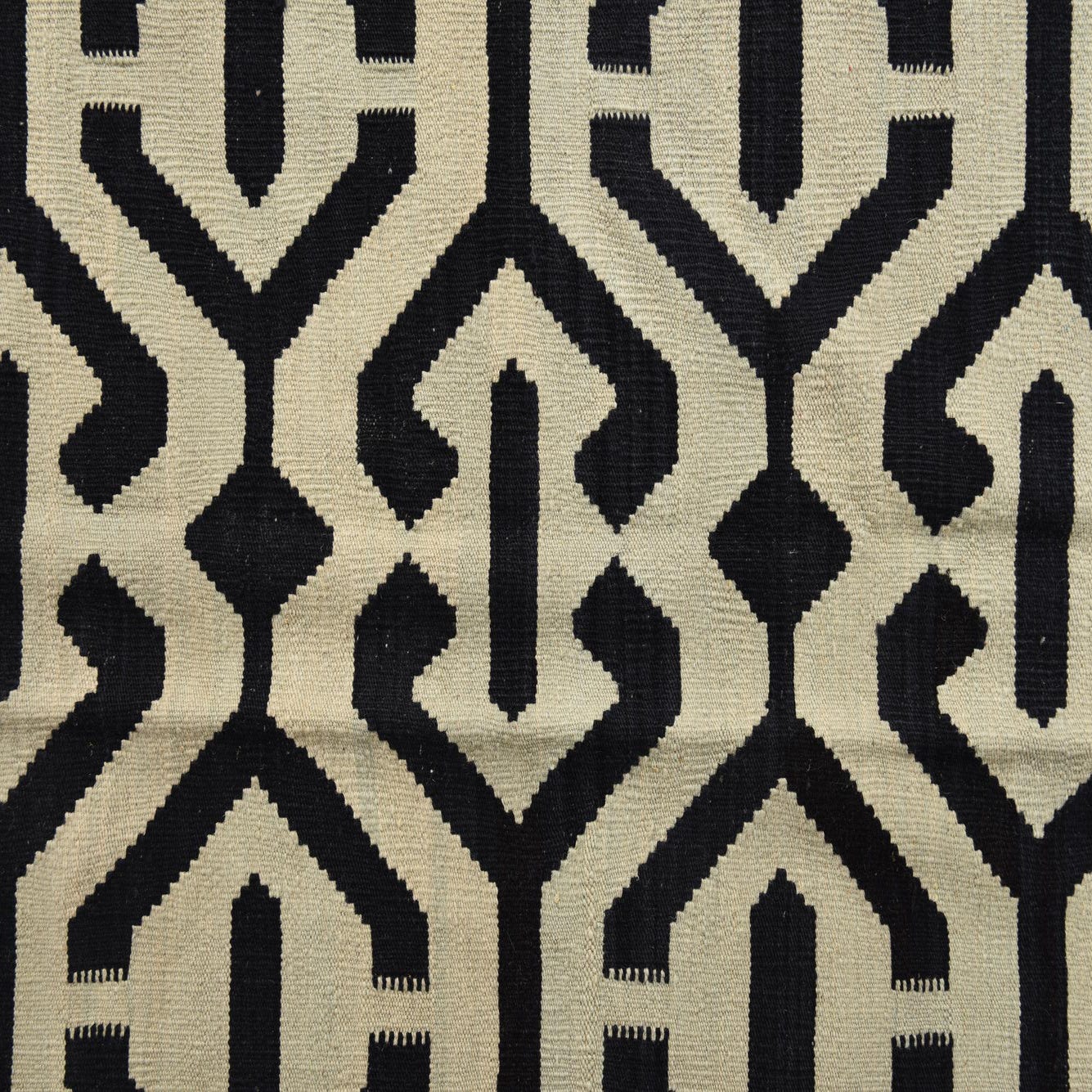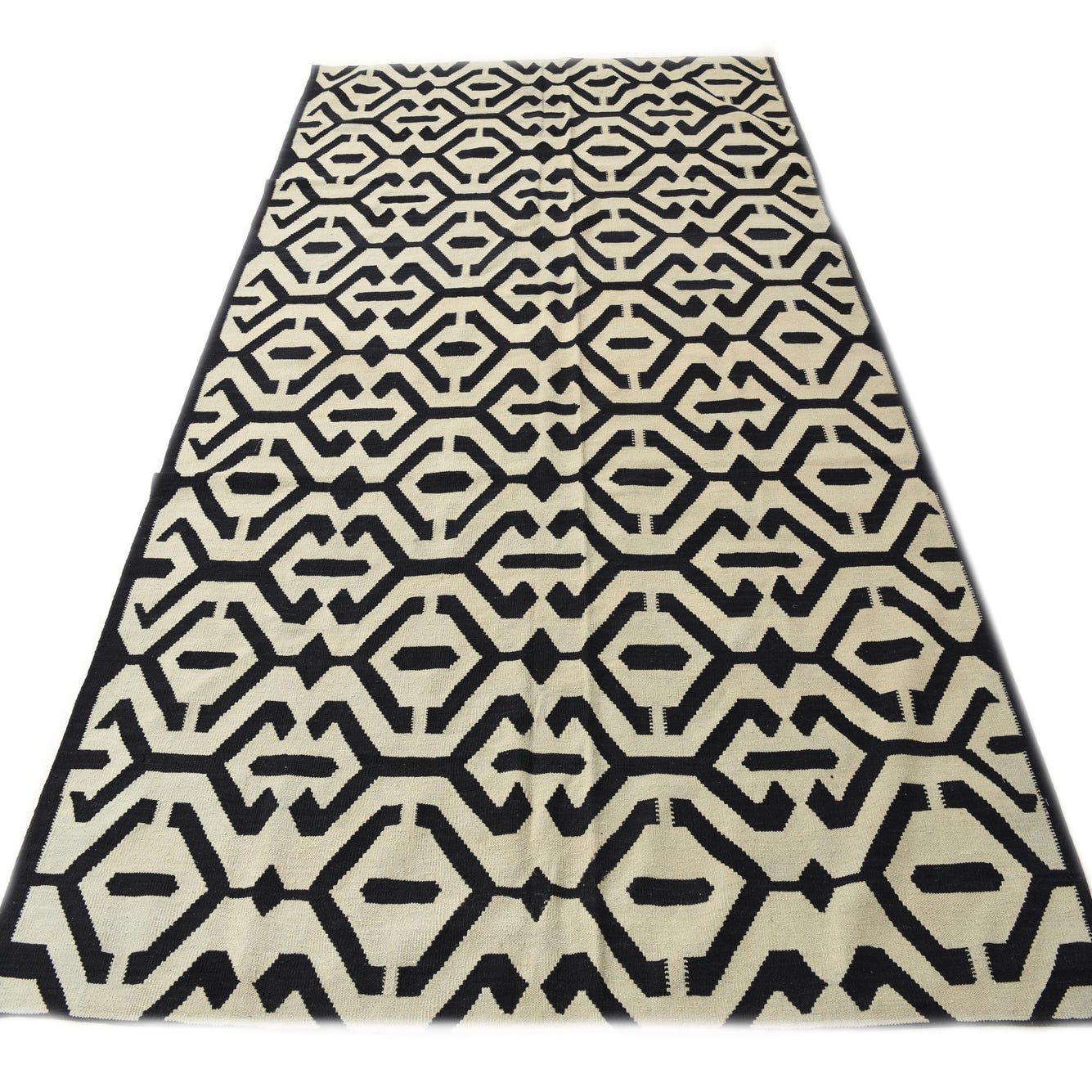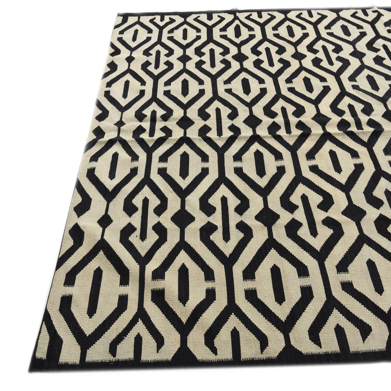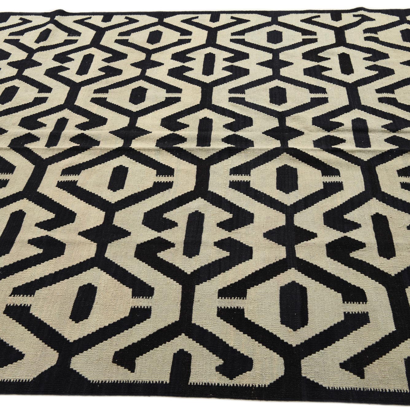 From the Kilim Modern collection, this 7x10 hand-woven rug showcases a dynamic geometric pattern that brings a hint of modernity and visual interest to any living space. The background of this piece is a contrast of black and white, making for a bold statement that can anchor a room with its distinct presence. Its construction from 100% wool endows the rug with a notable texture that not only adds to its aesthetic appeal but also contributes to its durability.