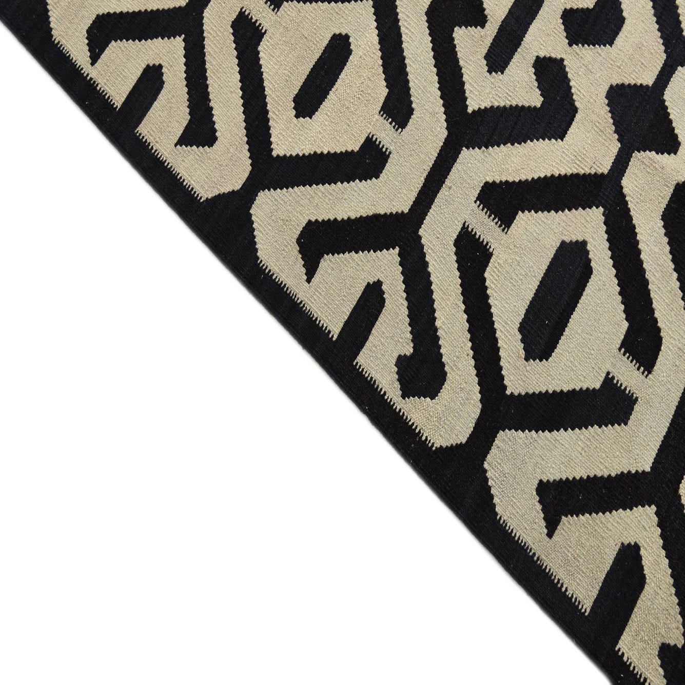 A 7x10 rectangular flatweave Kilim Modern rug featuring a bold black and ivory tribal geometric pattern.