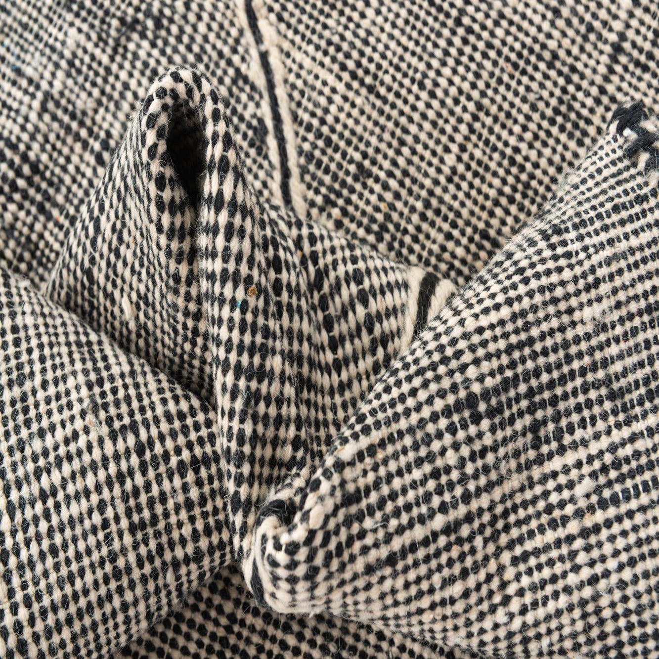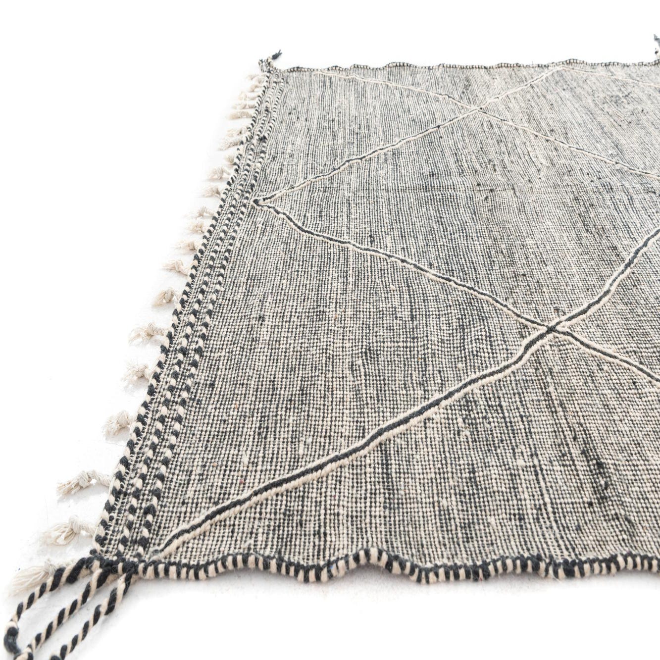 The addition of fringe on the edges adds an extra element of texture and a classic finish that harkens back to the rug's cultural origins. The black and white color scheme provides a versatile palette, allowing this rug to serve as a statement piece or complement a variety of décor styles.