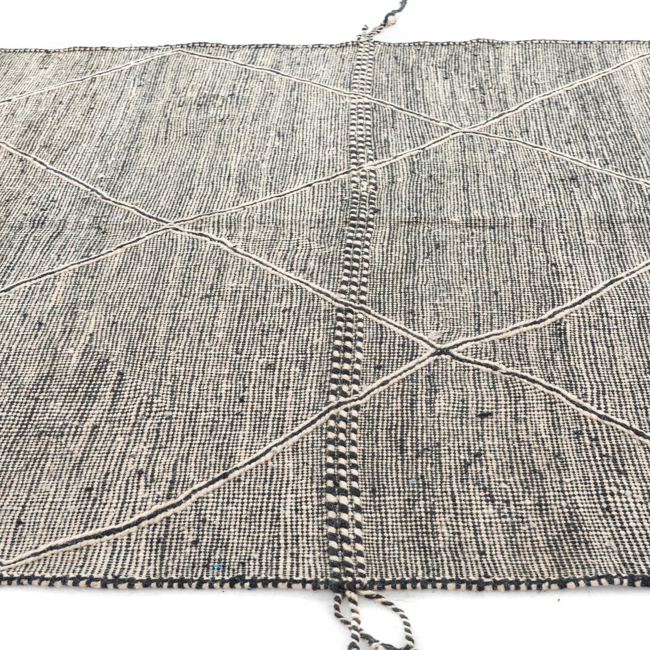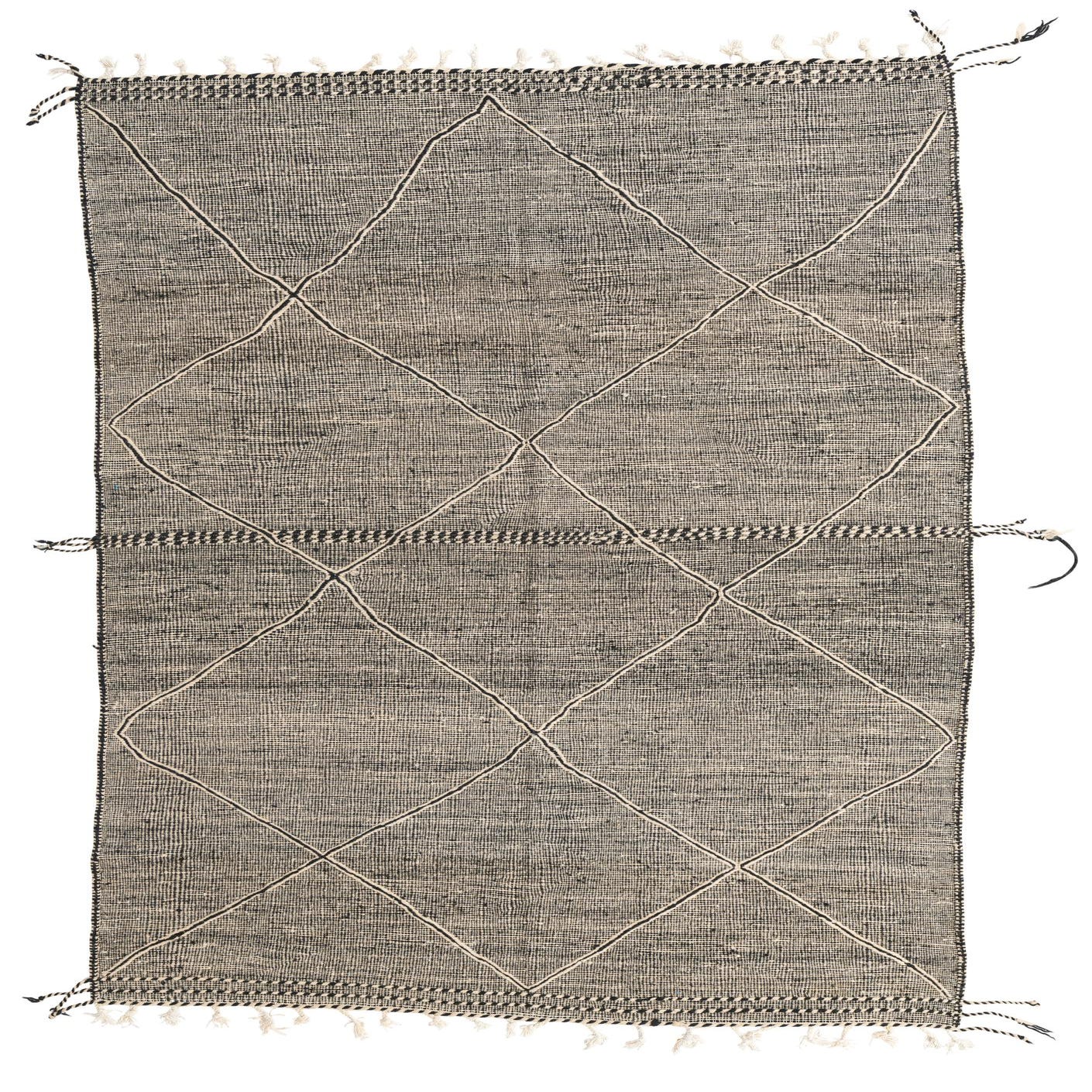 This Moroccan collection rug is a hand-knotted, authentic creation crafted from 100% wool, offering a touch of traditional craftsmanship to any space. Measuring 7x10 feet, the rug features a bold geometric pattern characterized by large diamond shapes outlined in a contrasting white hue against a rich black background. This contrast creates a dynamic visual interest while maintaining a clean and sophisticated appearance.