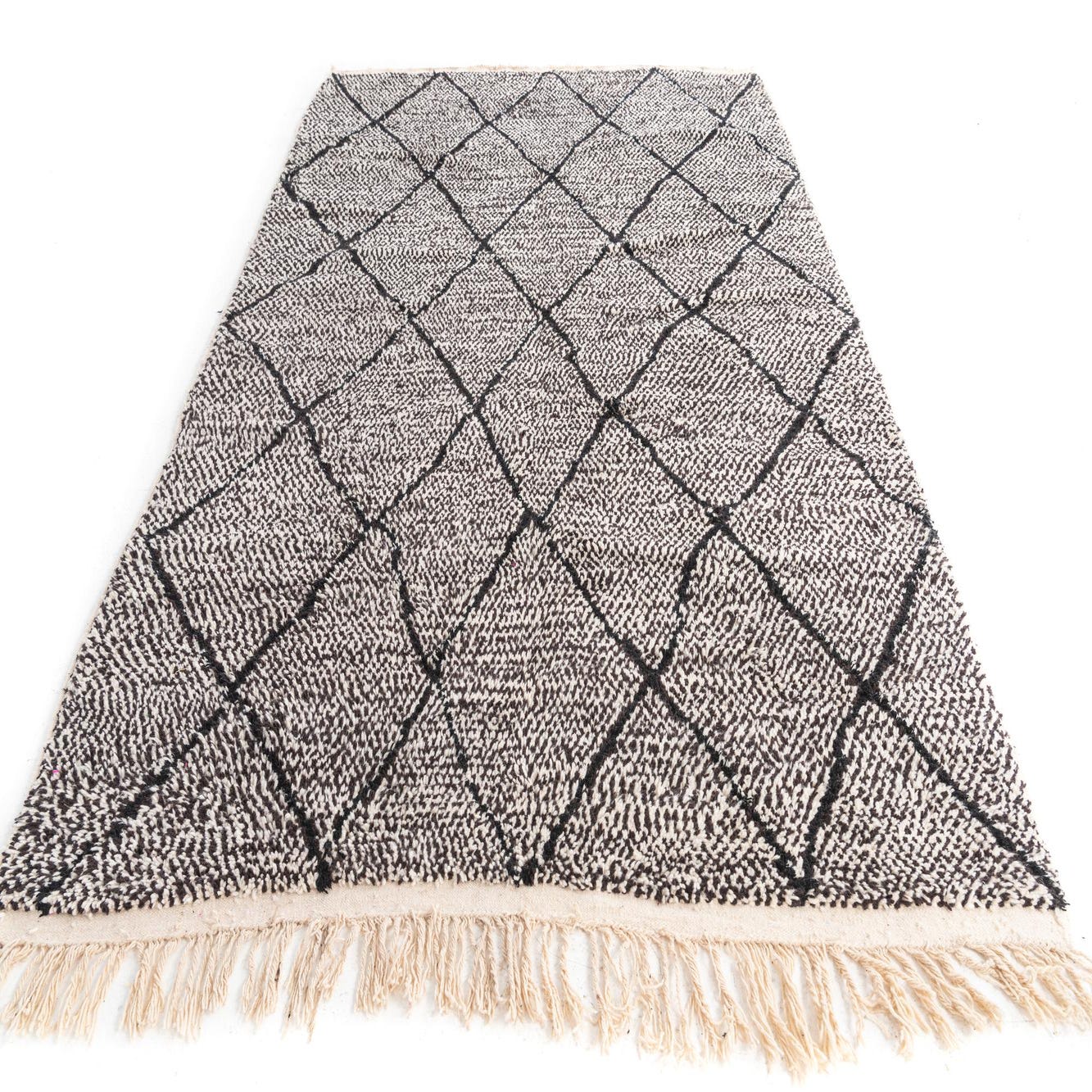 A 7x10 rectangular black and white Moroccan shag rug with a bold black diamond pattern and fringe.