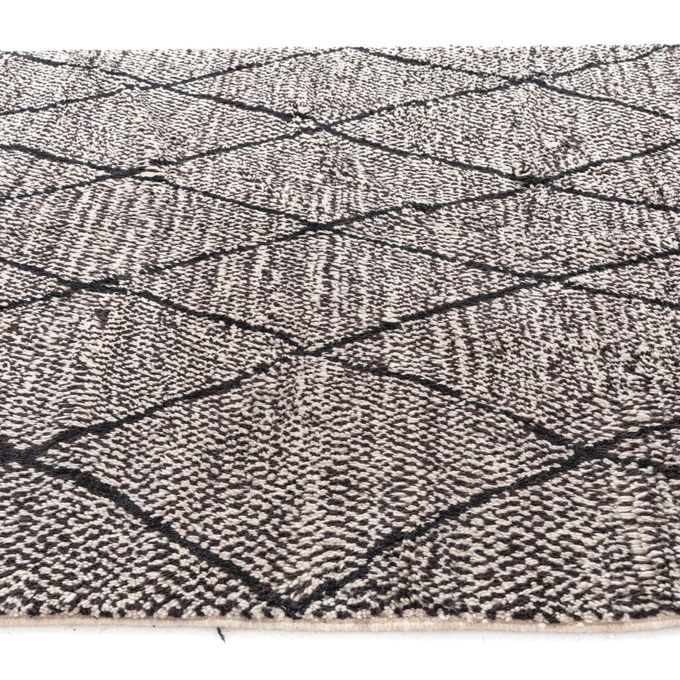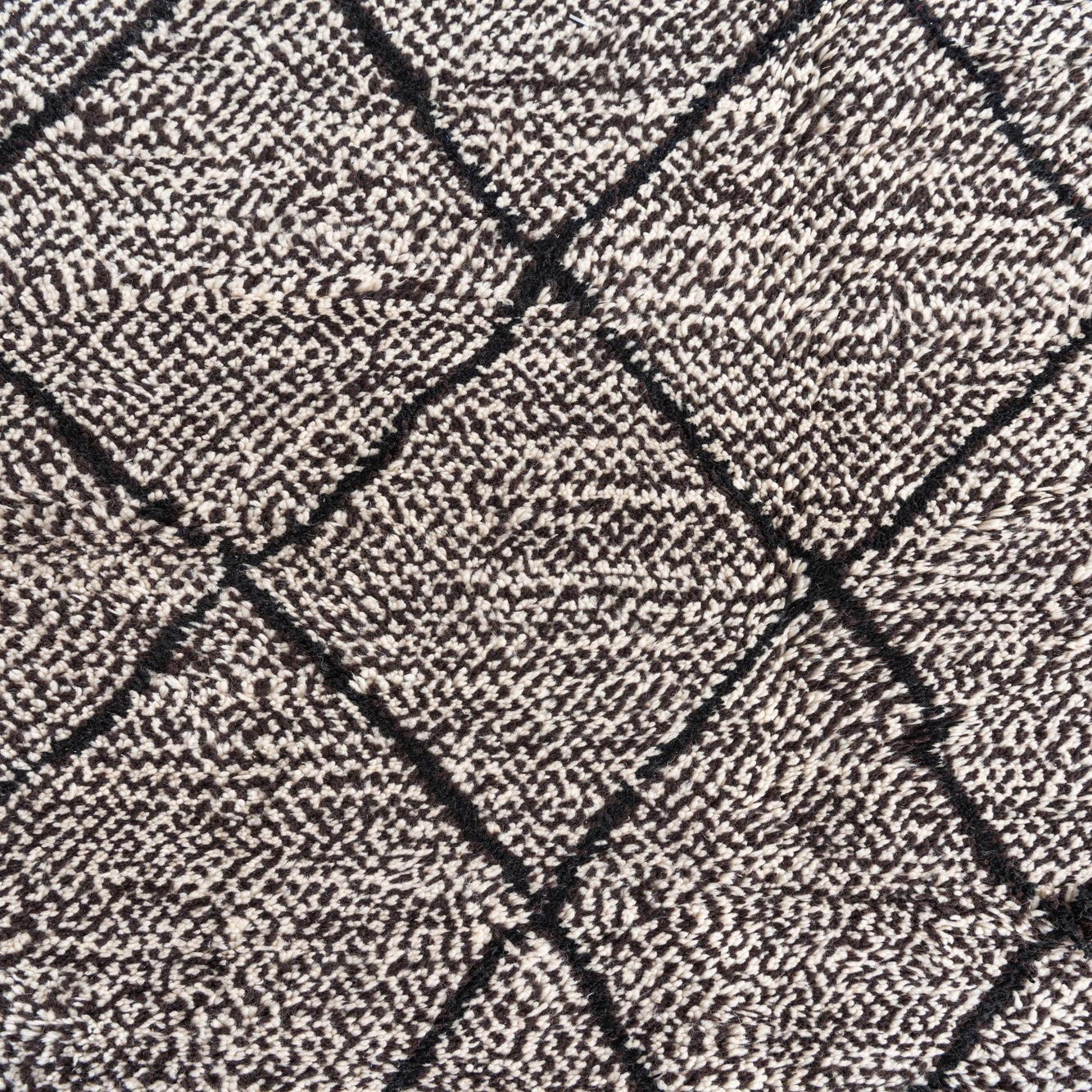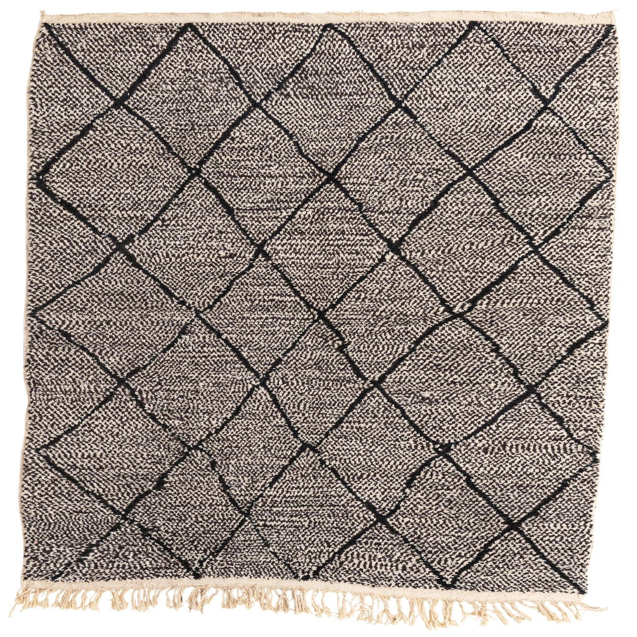 Hand-knotted from 100% wool, this rug pairs a hand-drawn diamond lattice with a textured, speckled ground in a clean black-and-white palette. Thick, slightly uneven black lines form an organic geometric pattern across a densely woven, ivory and black flecked field, finished with natural tassels at the ends. The wool pile has a comfortable, springy feel underfoot and a subtle surface loft that softens the graphic pattern while keeping the overall look grounded and tactile.