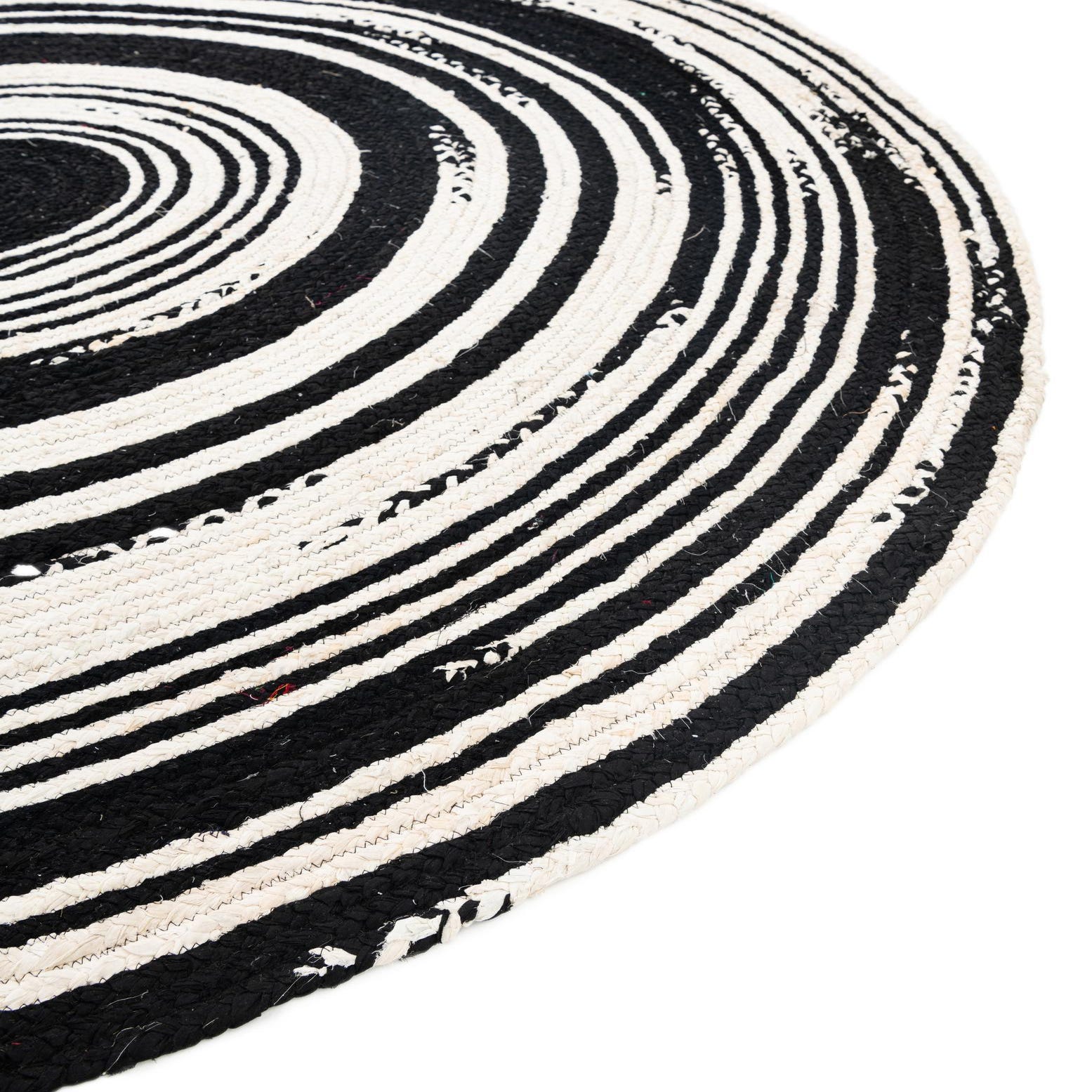 A bold concentric-ring pattern in black and ivory creates strong graphic interest while keeping the overall look clean and modern. Alternating bands of black and white form imperfect, hand-drawn circles with small distressed breaks that add character without overwhelming the design. Hand braided from 100% cotton, the rug has a low-profile, tactile surface—you can feel the braided coils beneath your feet and notice the slight variations that come from artisanal construction.
