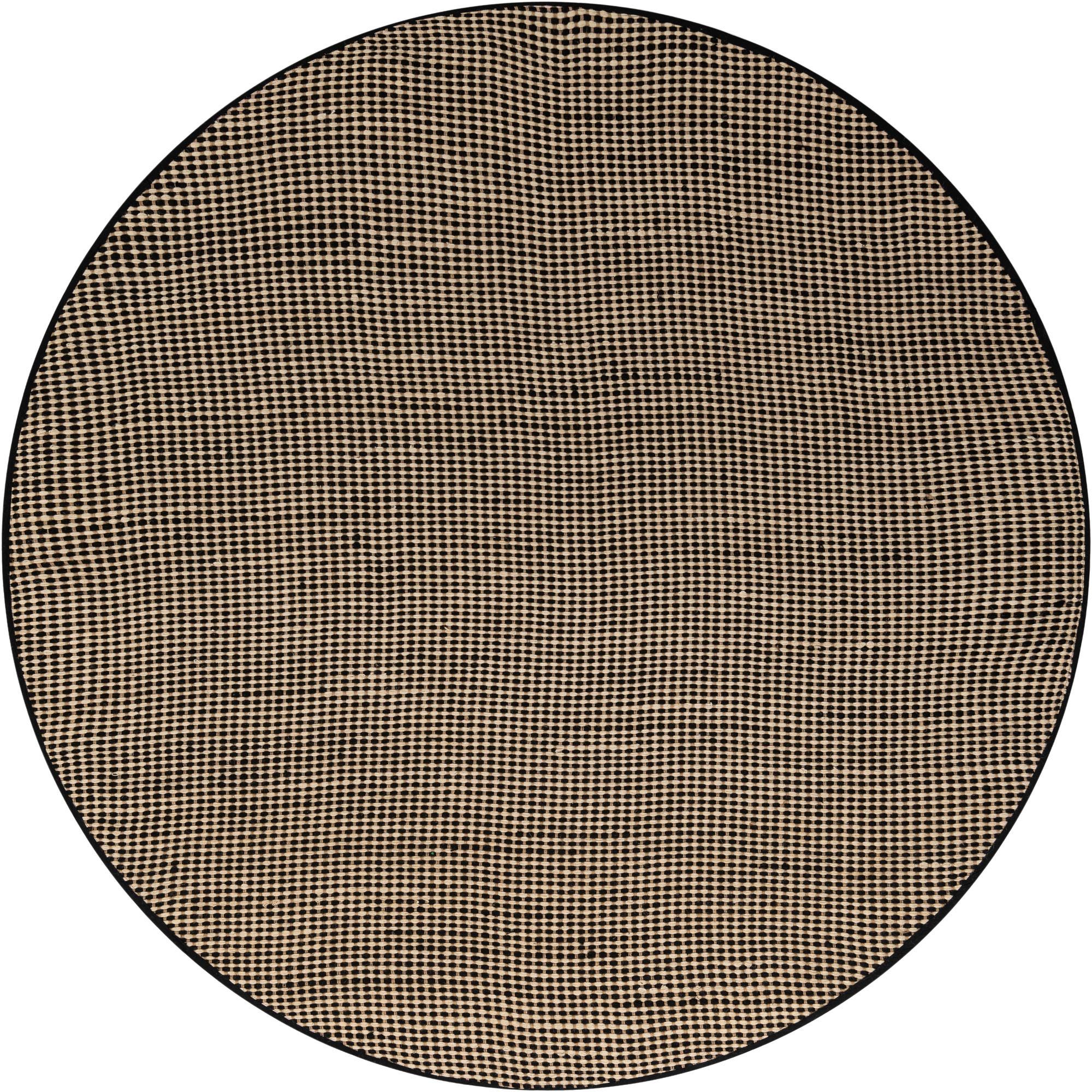 A round 7' 10" black and ivory jute rug with a modern dotted pattern, suitable for various indoor spaces.