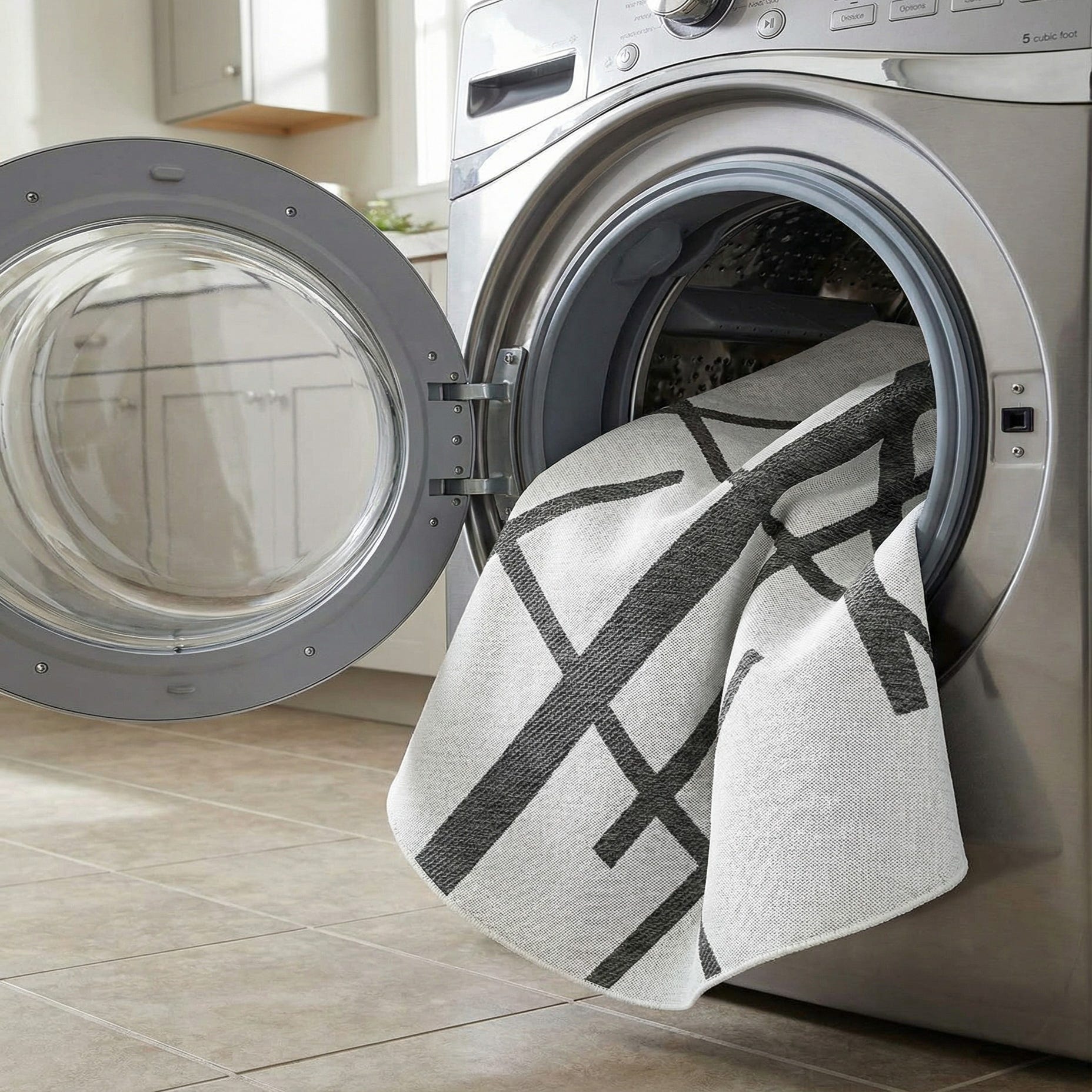 This piece works well on a covered patio or balcony beneath a round bistro table, as an anchor in a minimalist living room, or under a small dining set to introduce modern contrast. Pair it with warm wood tones and matte metal accents for a Scandinavian or industrial look, or layer it with soft textiles and pale furnishings to balance the bold graphic with a softer palette. The durable polypropylene construction makes it a practical choice for indoor-outdoor transitional areas and high-traffic rooms.