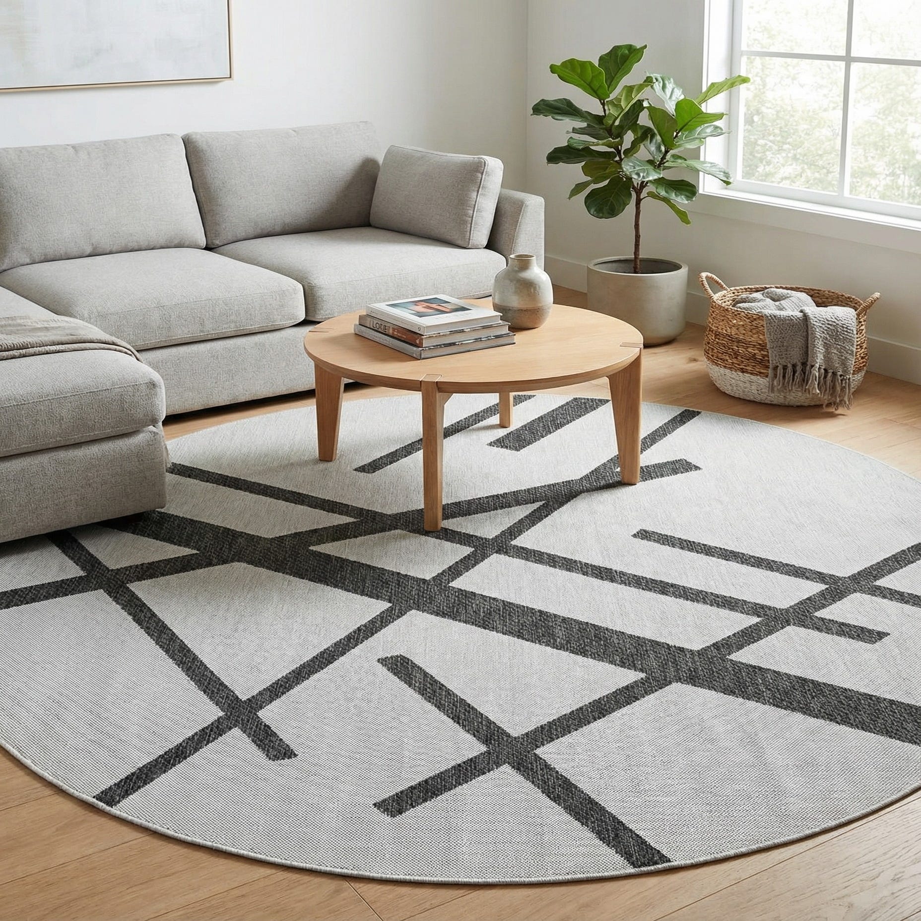 A dynamic round rug with a graphic, abstract pattern of intersecting black lines set against a clean white ground. The linear motif is contemporary and architectural, creating movement across the surface without overwhelming the space. Machine-made from 100% polypropylene, the low-profile, flatweave texture feels smooth underfoot with a slight ribbed hand where the darker strands cross the lighter field.