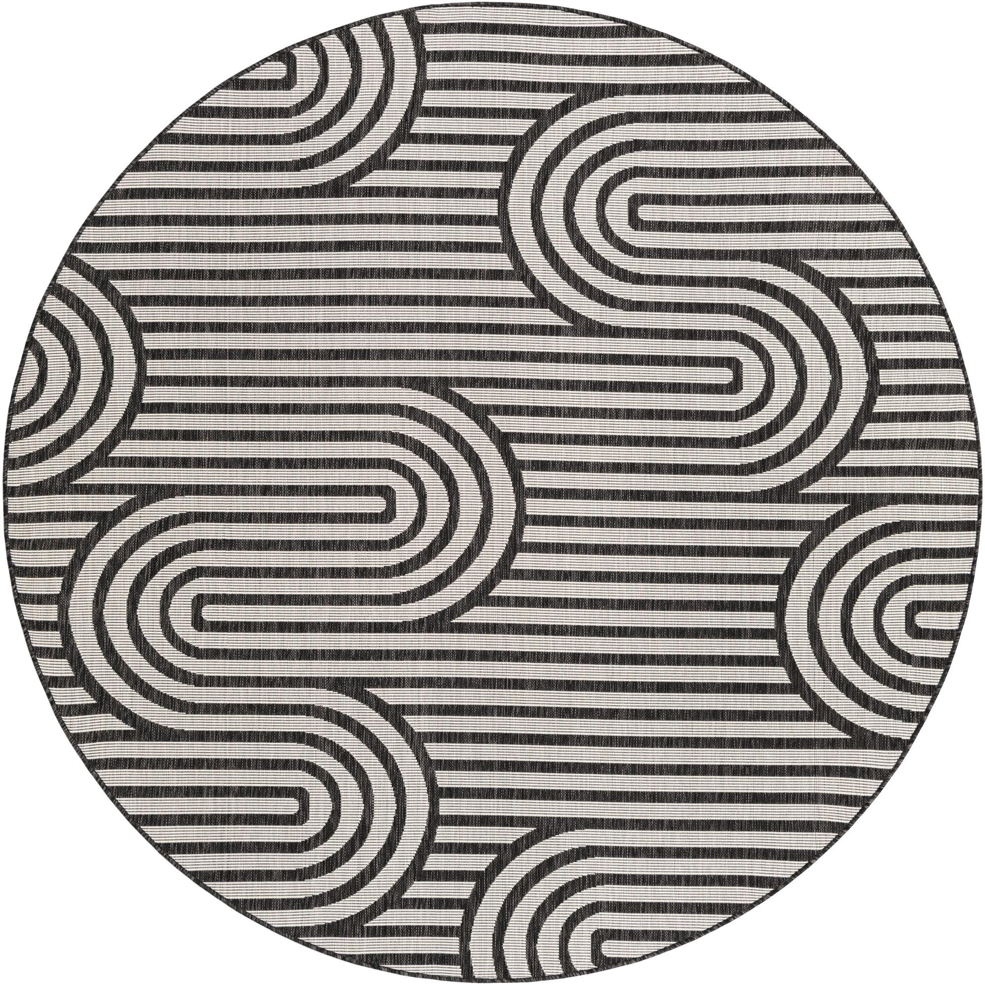 A bold black-and-white palette defines a crisp, graphic motif of parallel lines that curve into rounded, concentric forms across the round field. The machine-made construction in 100% polypropylene creates a low-profile, flatwoven surface with a subtle ribbed texture you can feel underfoot. The tight weave keeps the linear design sharp and structured, while the alternating black and white bands add visual rhythm and modern contrast.