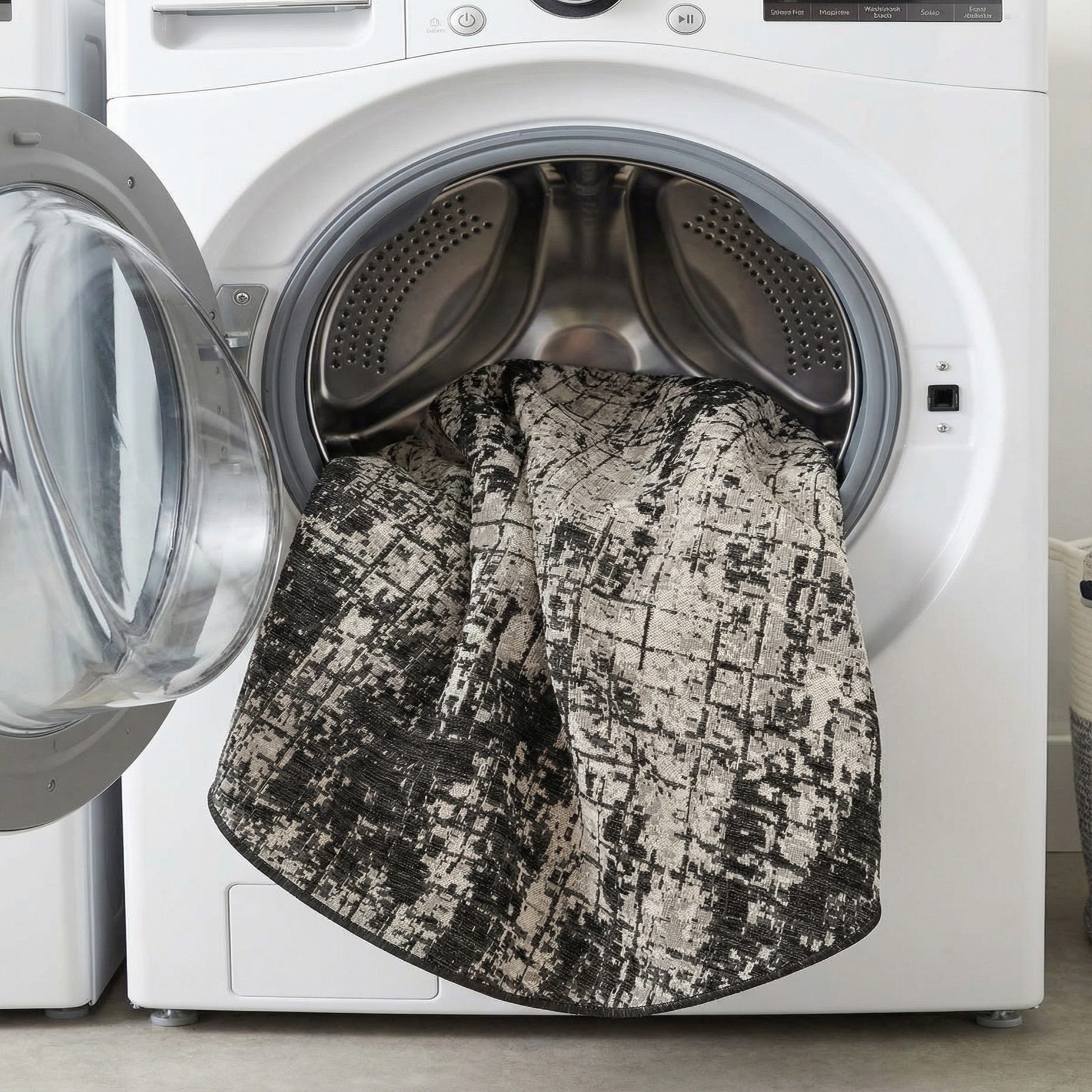 Machine-made from 100% polypropylene for outdoor use, this piece pairs easily with minimalist or industrial furnishings. Place it beneath a round dining table on a covered patio, anchor a small seating area on a balcony, or add high-contrast interest to a neutral living room or entry. It complements metal or concrete accents as well as warm wood tones, working well in modern, Scandinavian, and transitional settings.