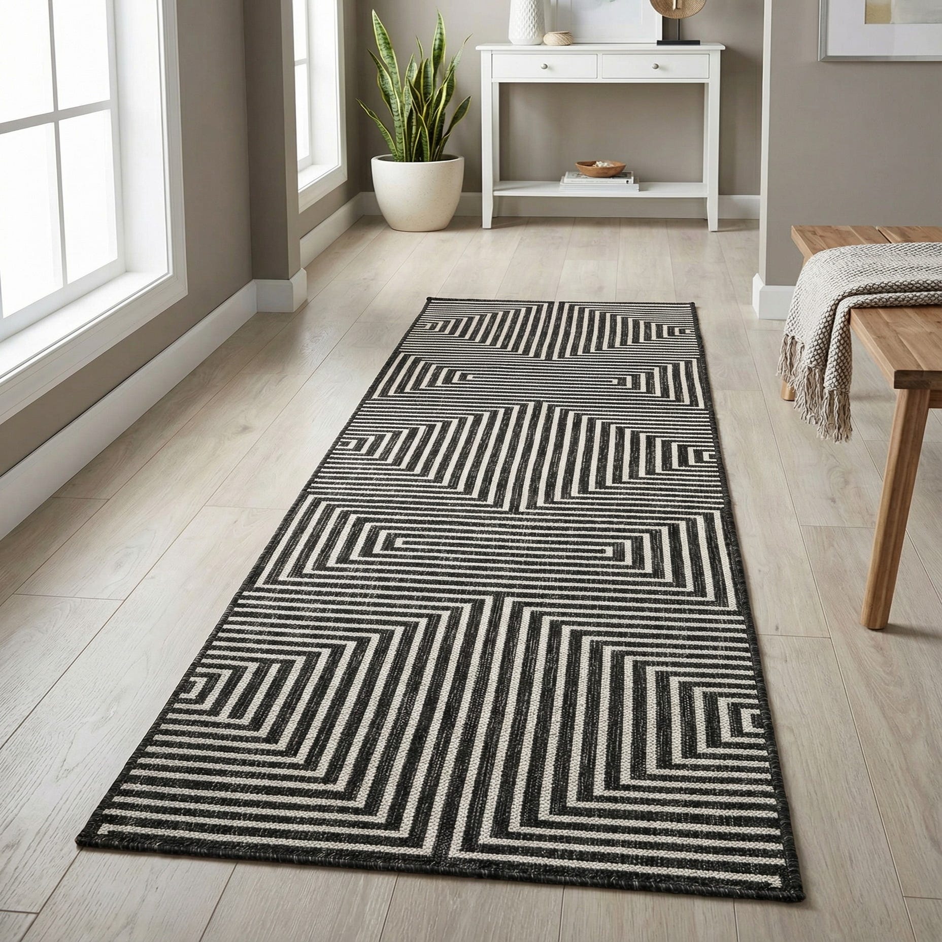 Given its contemporary design and utilitarian features, this runner is versatile for various settings. It can seamlessly integrate with minimalist decors, stand out in eclectic arrangements, or complement modern outdoor patios. Its clean lines and monochrome scheme can also serve as a grounding element in more vibrant interior spaces, making it a highly adaptable piece for a variety of home styling scenarios.