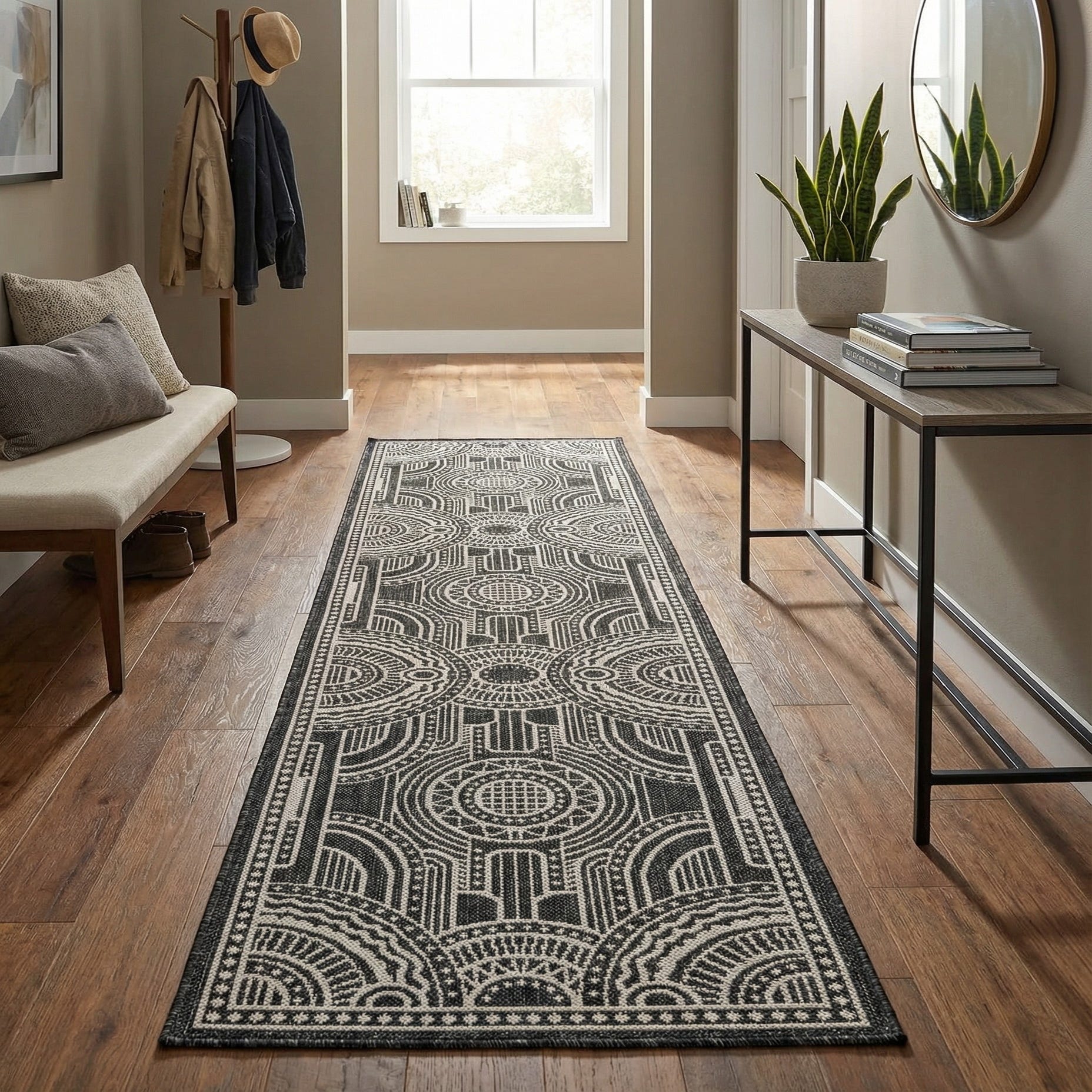 A black and white 8 ft runner rug with a repeating medallion and geometric pattern, ideal for a hallway or patio.