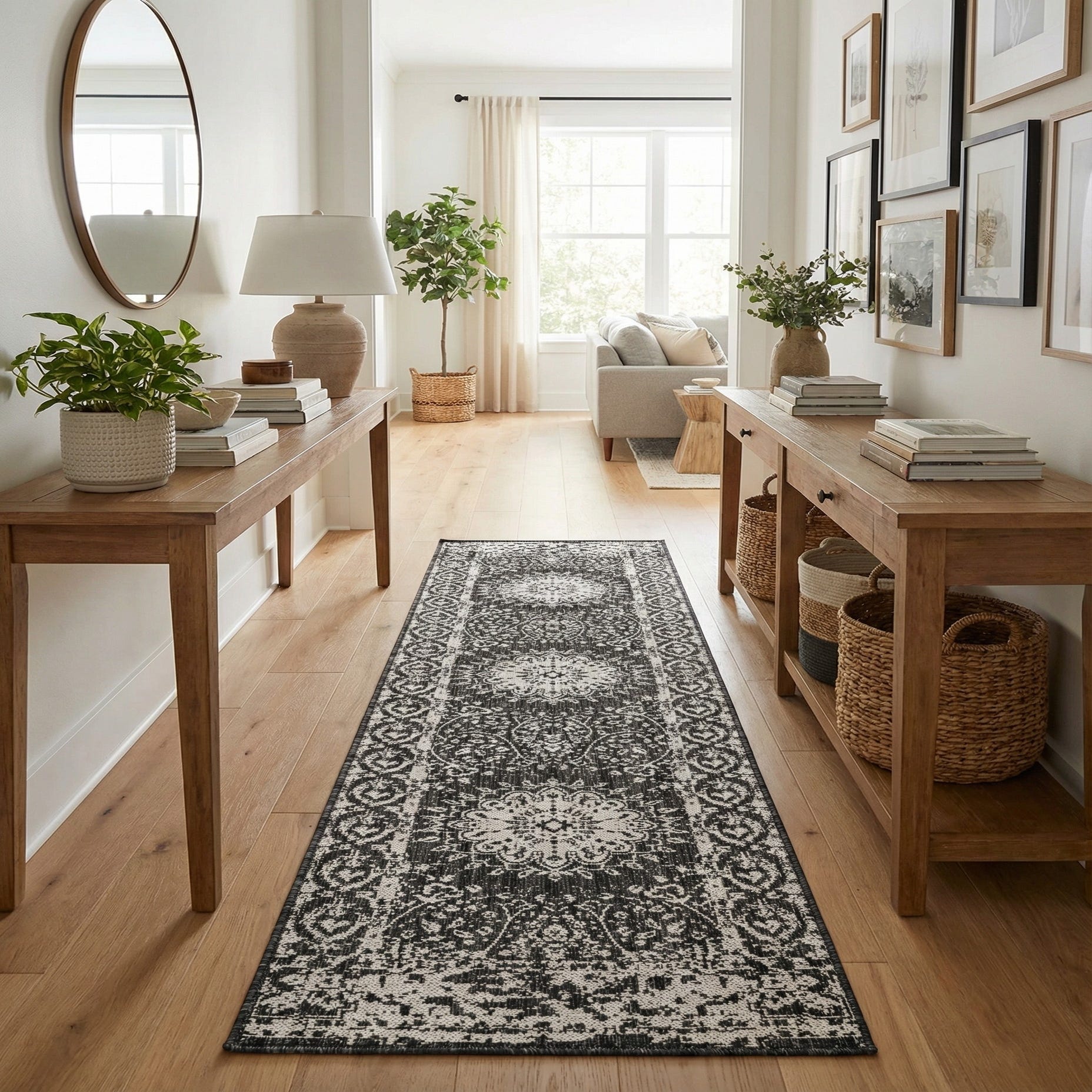 A black and white 8 ft runner rug with a distressed traditional medallion pattern, ideal for hallways or patios.