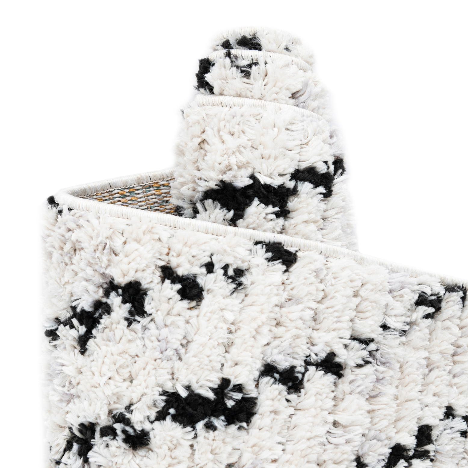 A black and white modern runner rug with a textured stripe and geometric diamond pattern, ideal for a hallway.