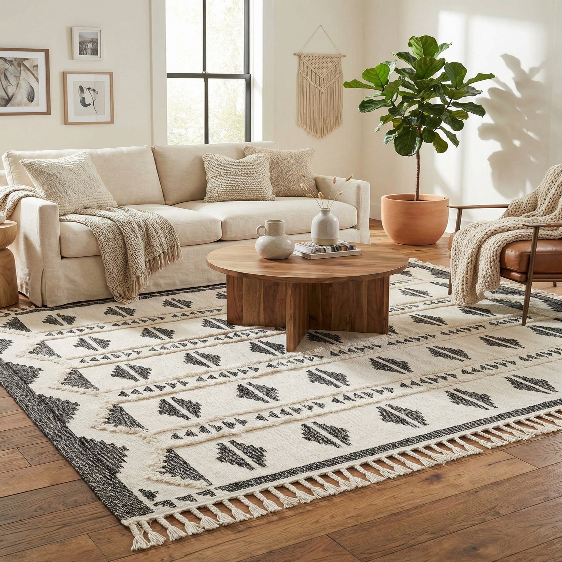 A bold black-on-cream geometric pattern gives this hand-woven wool rug a clean, graphic presence. Rows of diamond-like medallions alternate with linear arrow and triangular bands, all framed by narrow borders and finished with knotted fringe at the ends. The monochrome palette keeps the look modern while the repeating motifs add a hint of Southwestern and tribal influence.