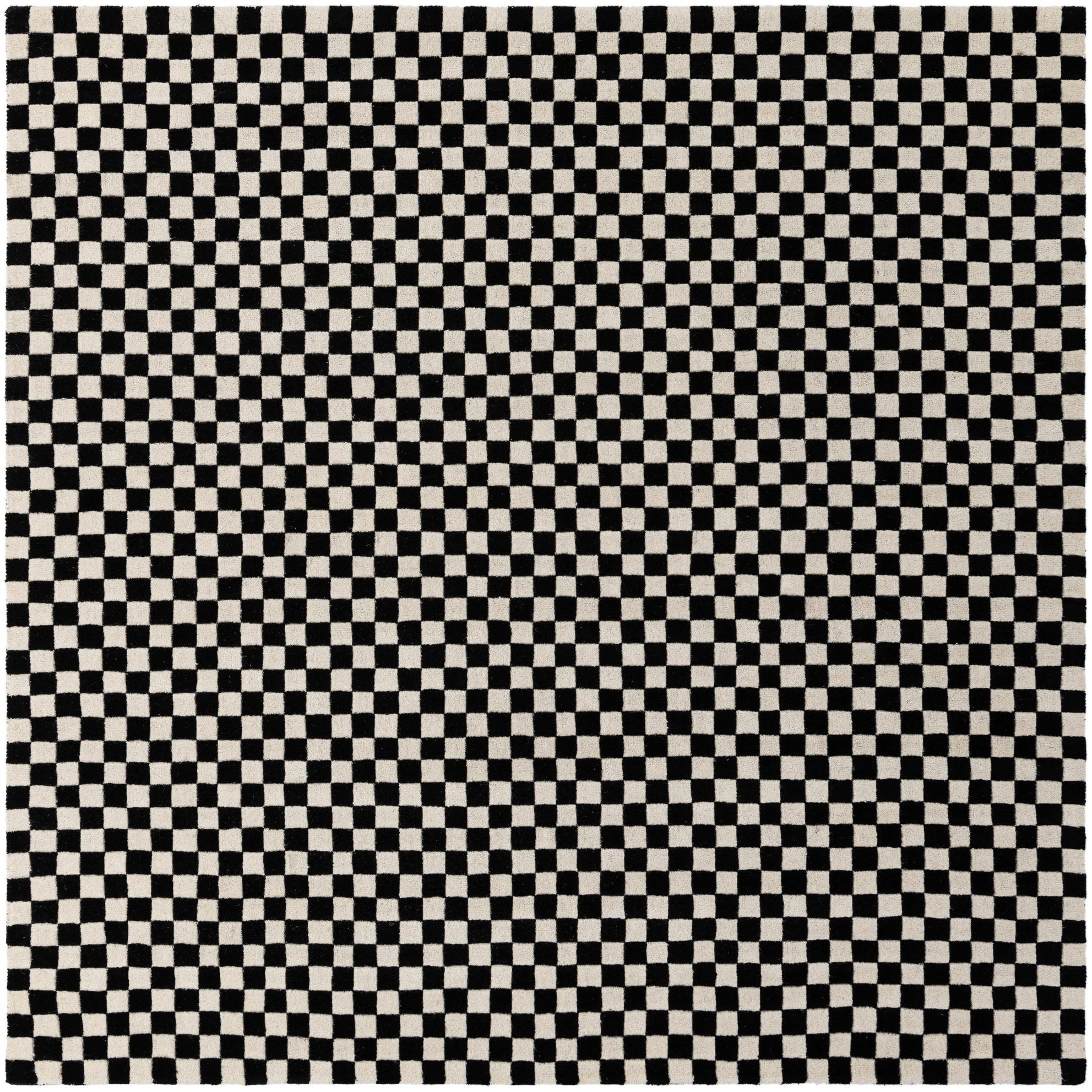 A crisp checkerboard of alternating black and white squares gives this square rug a clean, graphic presence. Hand-tufted from 100% wool, the surface has a soft, springy feel underfoot and a modest pile that creates subtle definition at the edges of each square. Running your hand across it, you notice the wool’s natural texture and the clear contrast between the dark and light fields, which keeps the pattern bold without feeling flat.