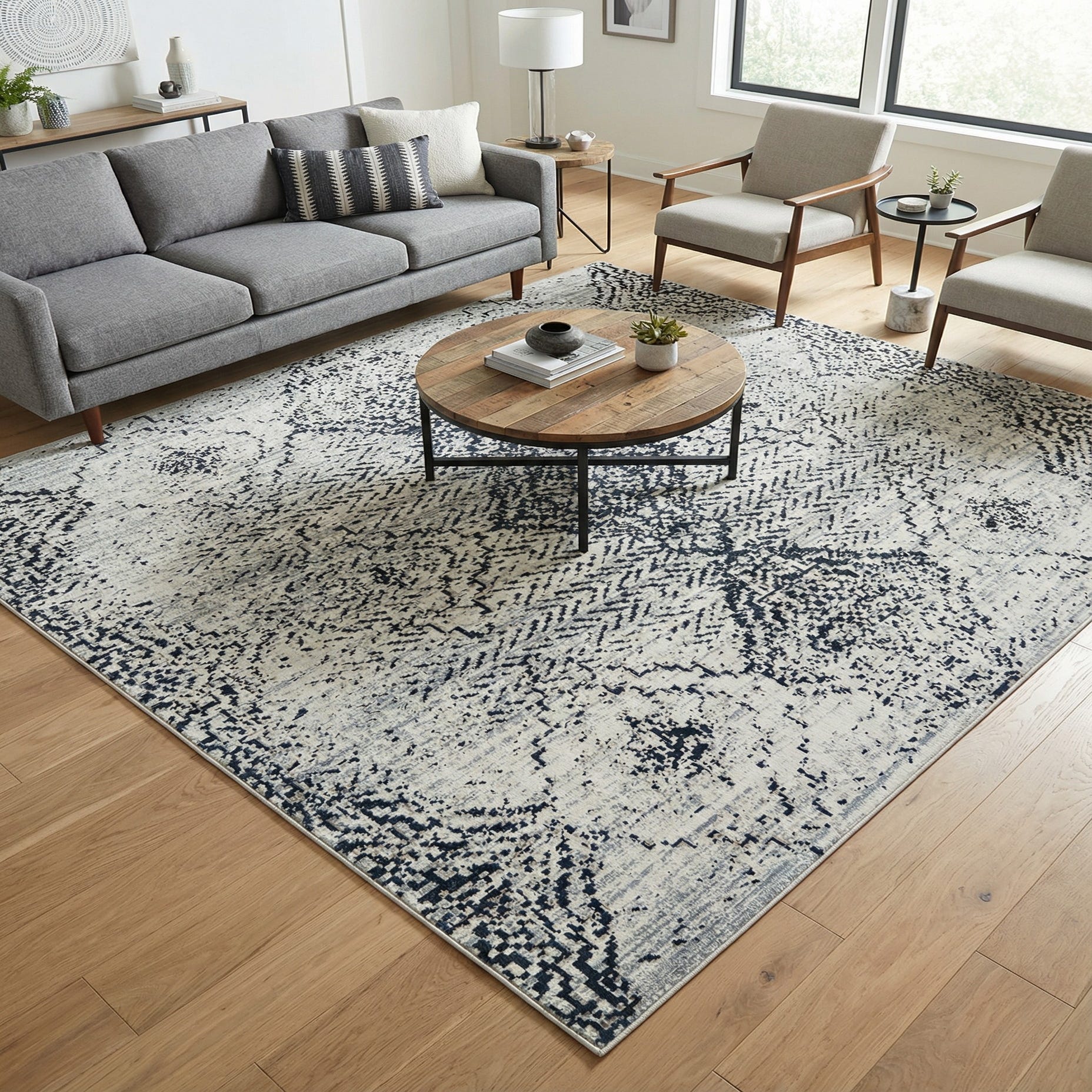 The graphic yet muted pattern pairs well with contemporary and transitional interiors — think clean-lined sofas, warm wood furniture, or black metal accents. Use it to anchor a seating area beneath a coffee table, add contrast in a bedroom against light floors, or define a casual dining space. It also layers nicely over natural-fiber rugs for added depth in minimalist, Scandinavian, or industrial-inspired rooms.