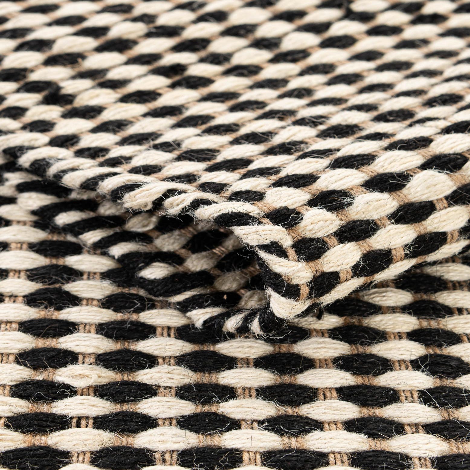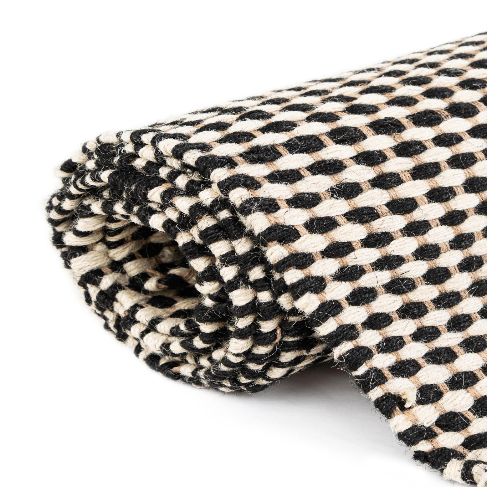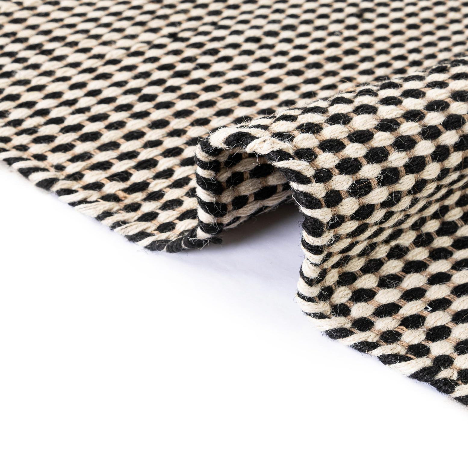 A tightly woven black-and-white pattern gives this rug a refined, peppered grid that adds quiet visual interest without dominating a room. Hand woven from 95% jute and 5% cotton, the flatweave surface has a low profile and a natural, slightly textured hand — the jute provides firm, tactile character while the cotton adds a subtle softening to the weave.