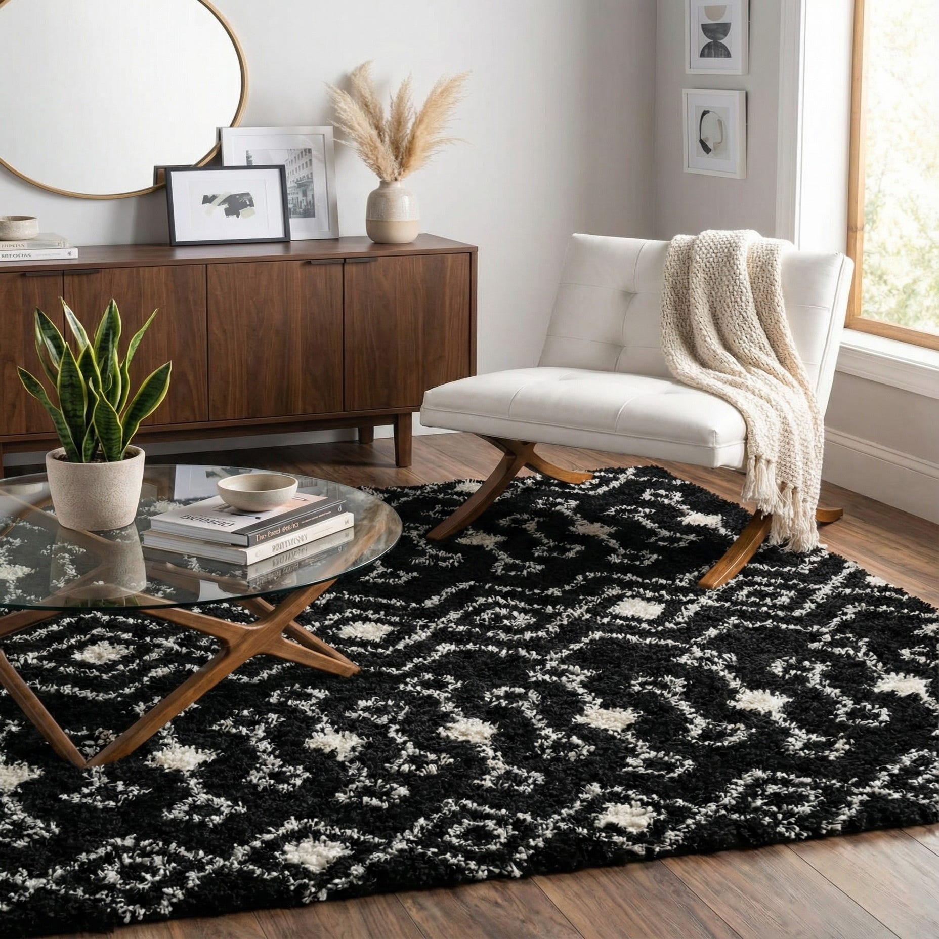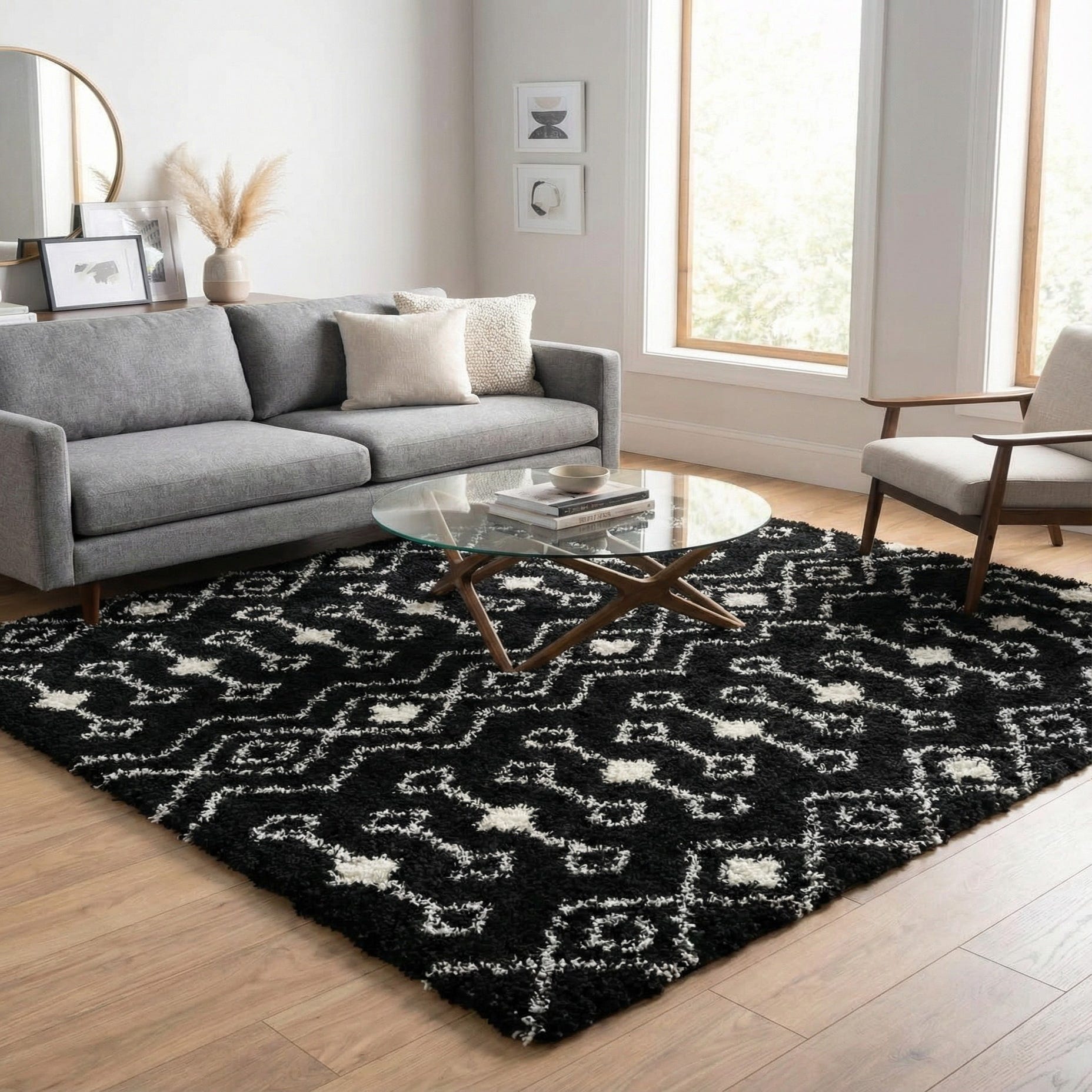 A bold black ground sets the scene for a high-contrast geometric trellis and diamond motif rendered in crisp white yarns. Rows of vertical lozenges and interlocking diamond bands create a structured, modern-tribal layout that reads graphic from a distance and reveals soft, shaggy texture up close. Machine-made from 100% polypropylene, the high-pile shag construction feels plush underfoot while the slightly variegated white yarns add subtle depth to the surface.