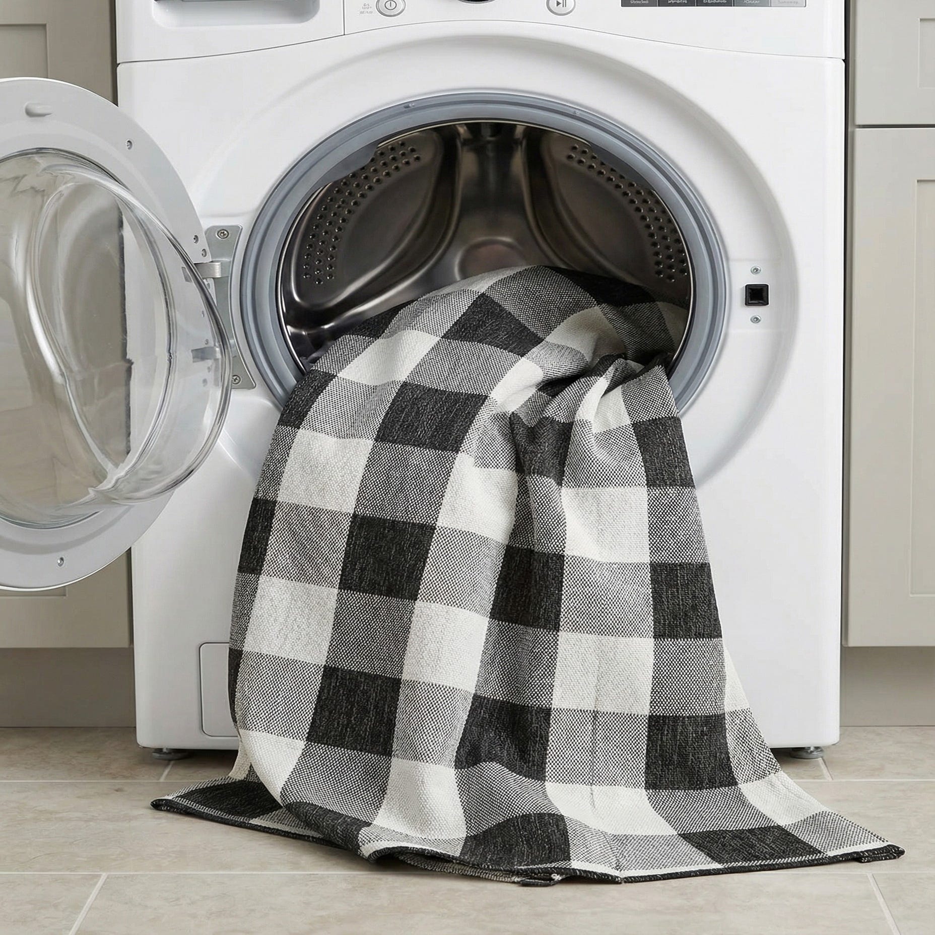 Bold black-and-white checks form a classic buffalo-check pattern that reads both crisp and casual. Machine-made from 100% polypropylene, the rug has a tight, flatwoven construction with a subtle two-tone texture where the yarns cross, giving each square a bit of depth without adding pile. The surface is low-profile and slightly textured to the touch, with neat finished edges that keep the graphic grid looking clean.