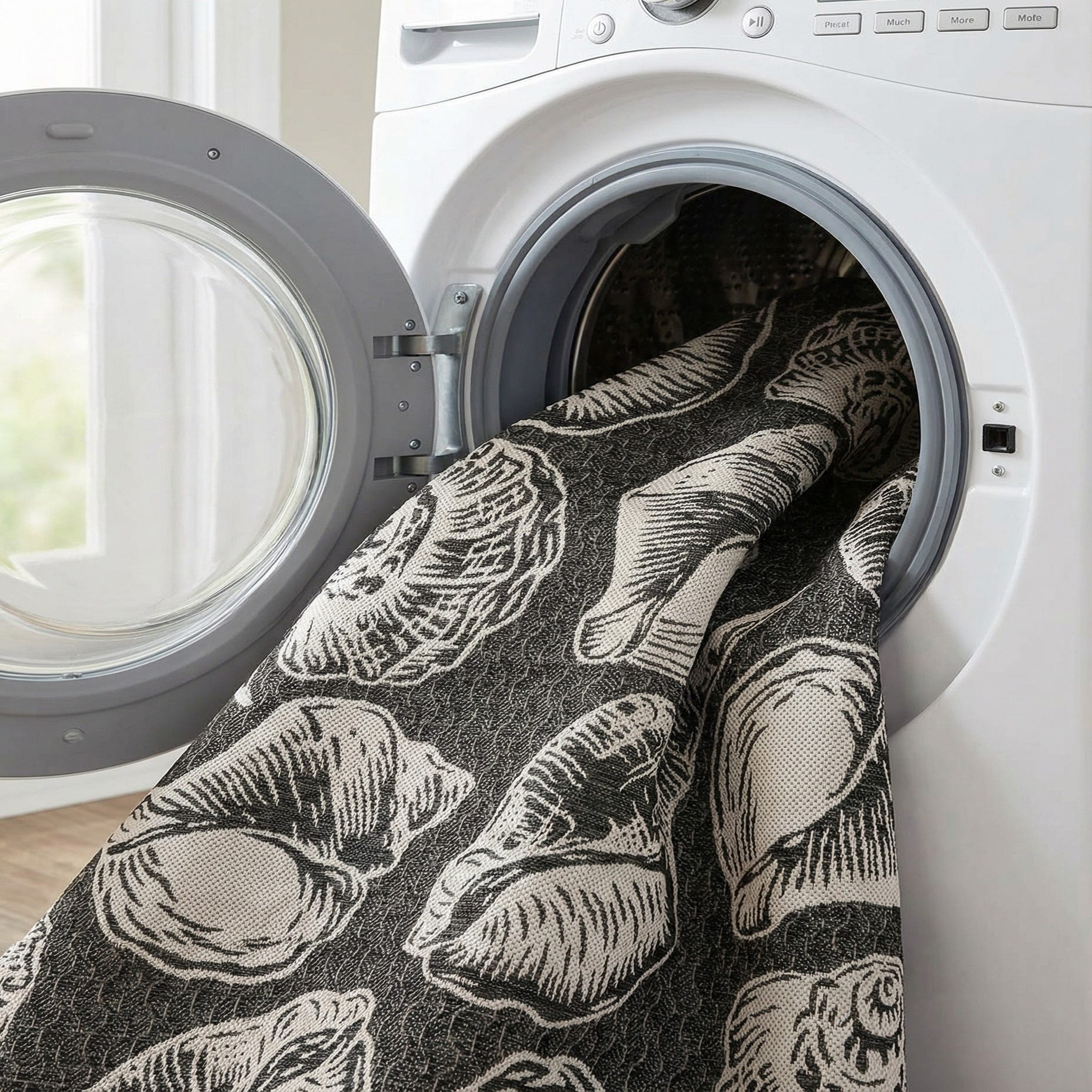 A square black and ivory outdoor rug featuring various detailed seashell patterns, ideal for a patio.