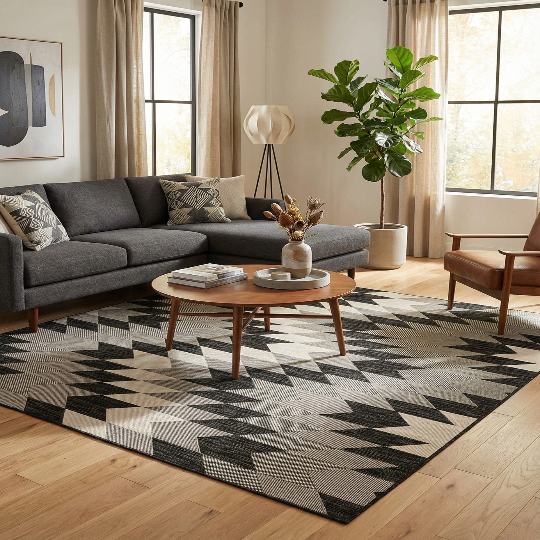 A 7' 10 x 7' 10 square Rugs.com Outdoor Modern rug featuring a bold black, white, and grey geometric tribal pattern.