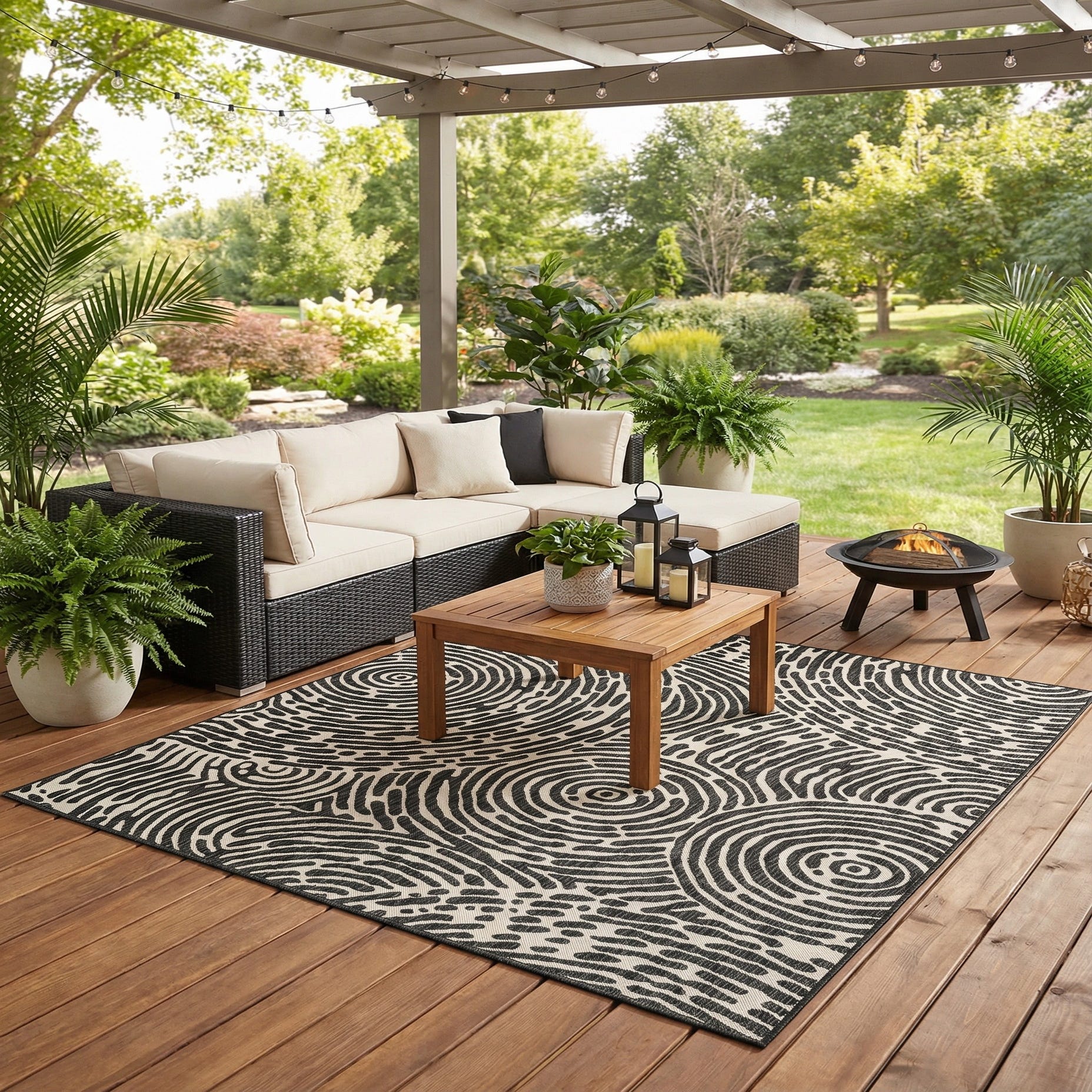 Part of the Outdoor Modern Collection, this 8 Ft Square polypropylene rug presents a design that’s both visually striking and versatile. The rug features an abstract, concentric circle pattern that offers a dynamic and modern feel, with contrasting black and white hues adding a bold graphic element to any space. The flatweave construction provides a smooth texture that is comfortable underfoot, while being suitable for high-traffic areas.