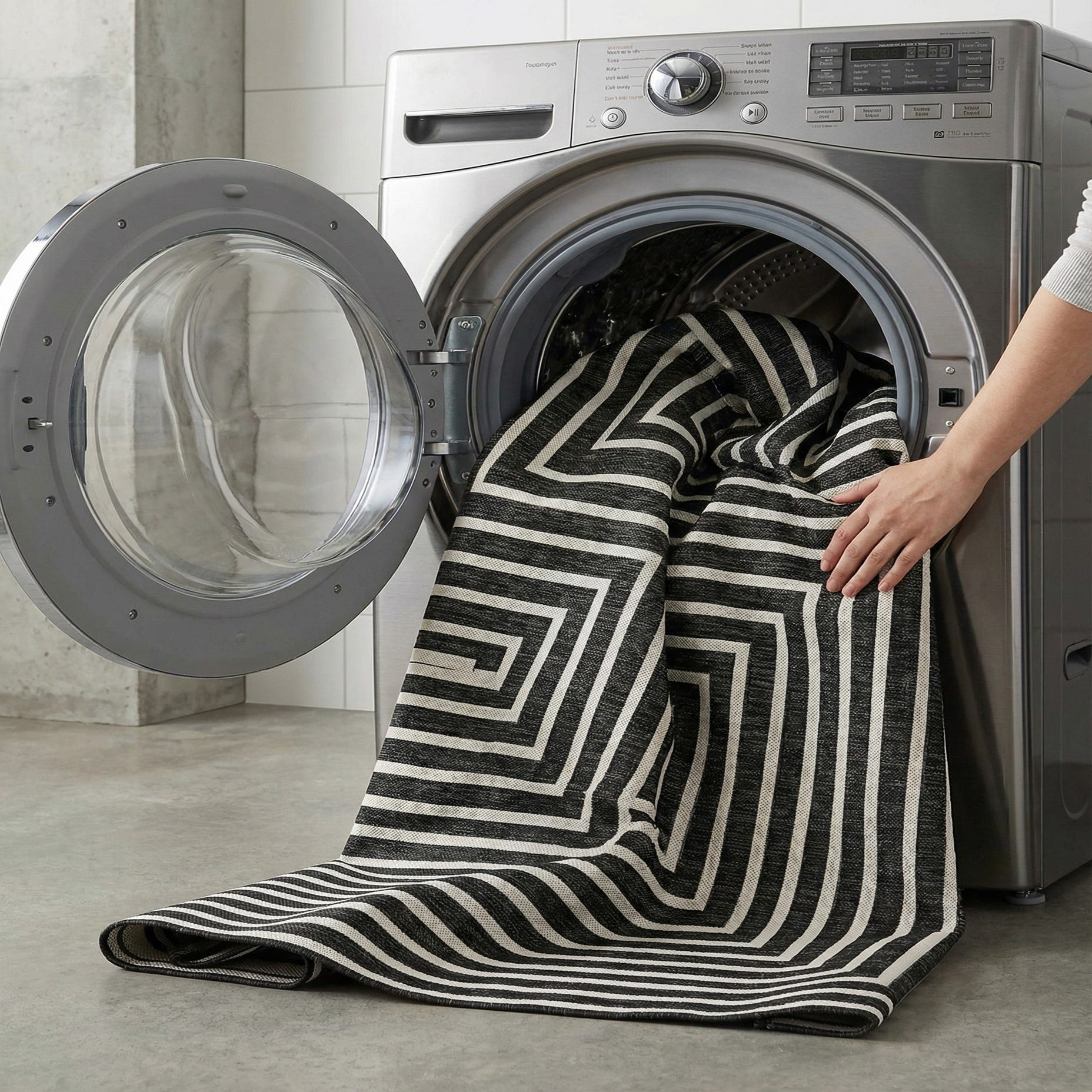 The flatweave construction contributes to the rug's sleek profile while enhancing its functional appeal – it is stain-resistant, pet-friendly, and does not shed, which is ideal for higher traffic areas. This rug's precise patterns and stark contrast make it a versatile piece that can complement a variety of décor styles, especially modern, minimalist, and Scandinavian-inspired settings.