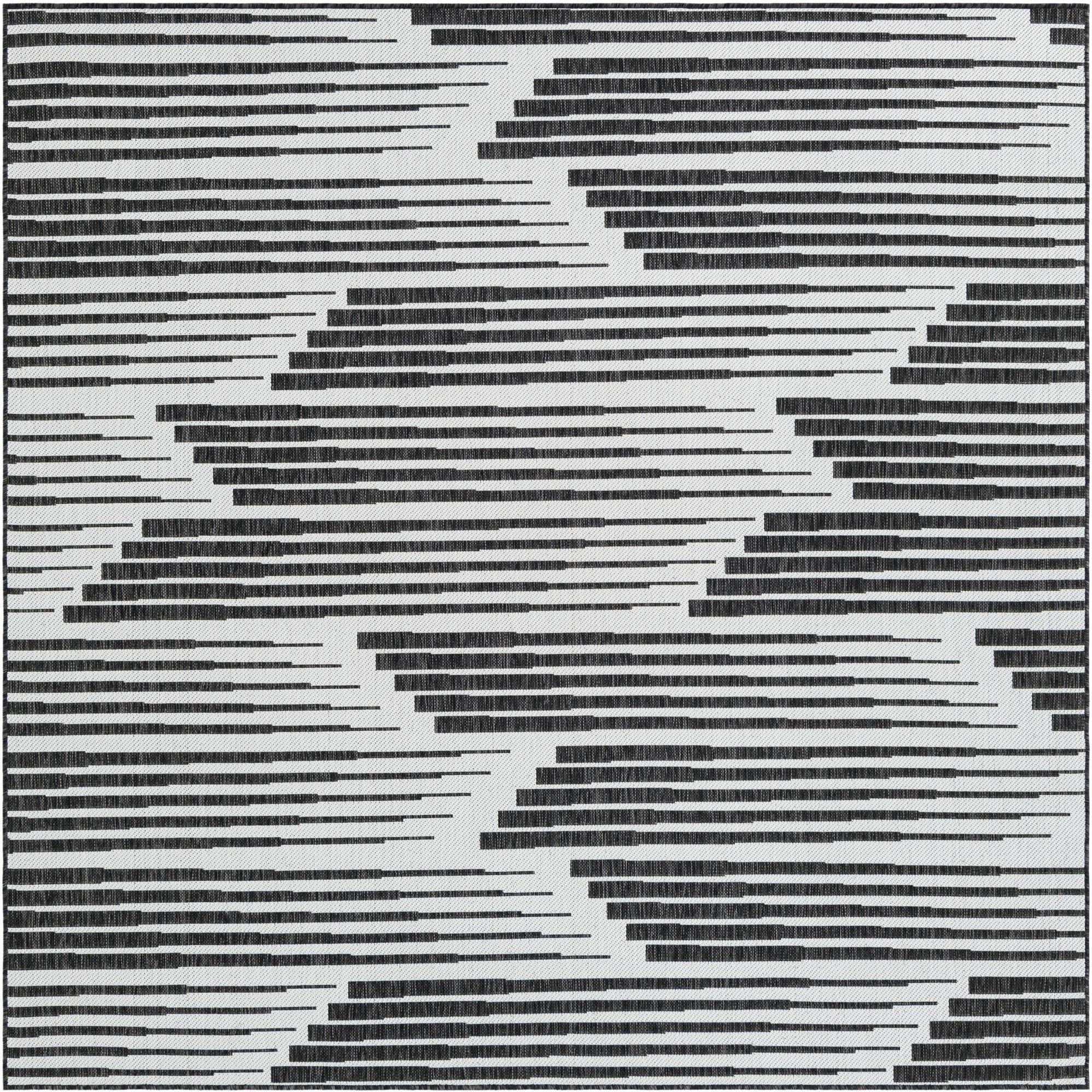 A 7' 10 x 7' 10 square black and white rug featuring a modern, abstract stripe pattern, suitable for a patio.