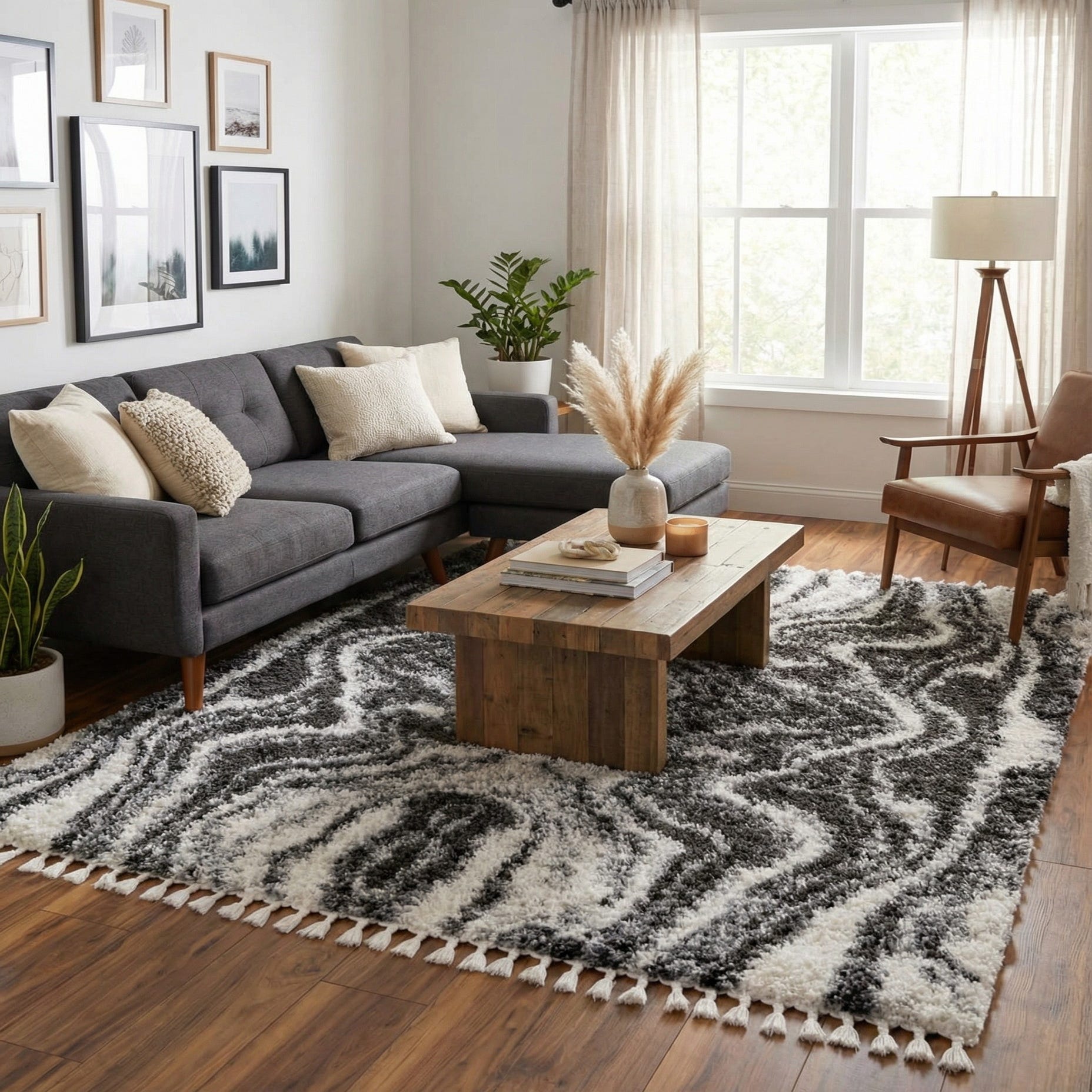 Machine made of 100% polypropylene, the rug has a plush shag pile that invites touch — the fibers compress softly underfoot and spring back when brushed. The texture adds a cozy layer to a room while the bold pattern keeps the look contemporary. Ideal for a minimalist living room anchored by mid-century or modern furniture, a monochrome bedroom where tactile contrast is needed, or a loft-style space with metal and glass accents, this rug also works well to ground seating arrangements or define an open-plan area.