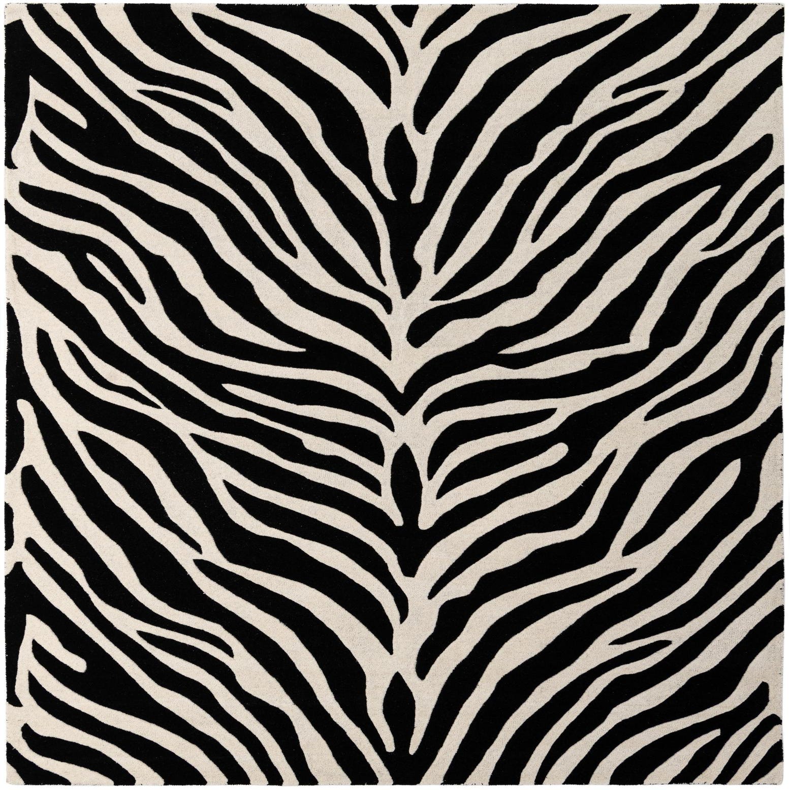A rectangular 8x10 black and white area rug with a bold zebra stripe pattern, made from wool.