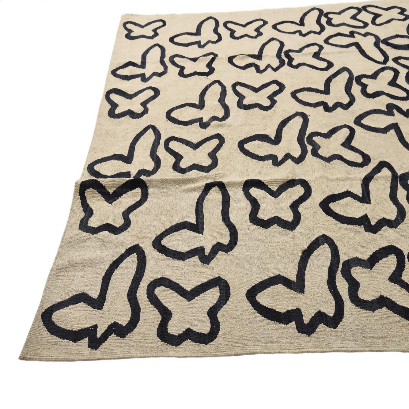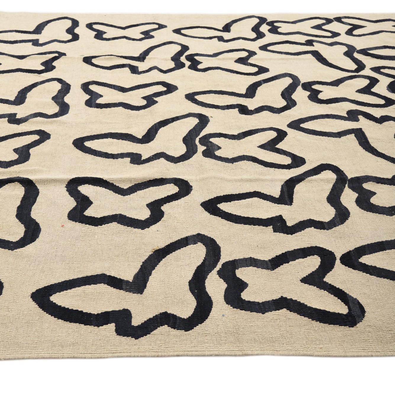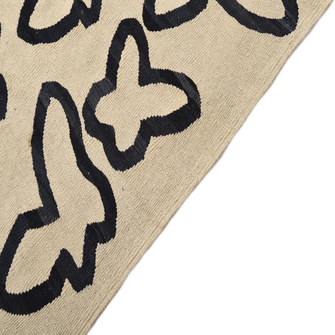 Part of the Kilim Modern collection, this hand-woven rug measures 8x10 feet and is crafted from 100% wool, offering a durable and tactile underfoot experience. The rug features a bold, abstract pattern dominated by black outlines of asymmetrical shapes on a crisp white background, providing a striking visual contrast that captures attention.