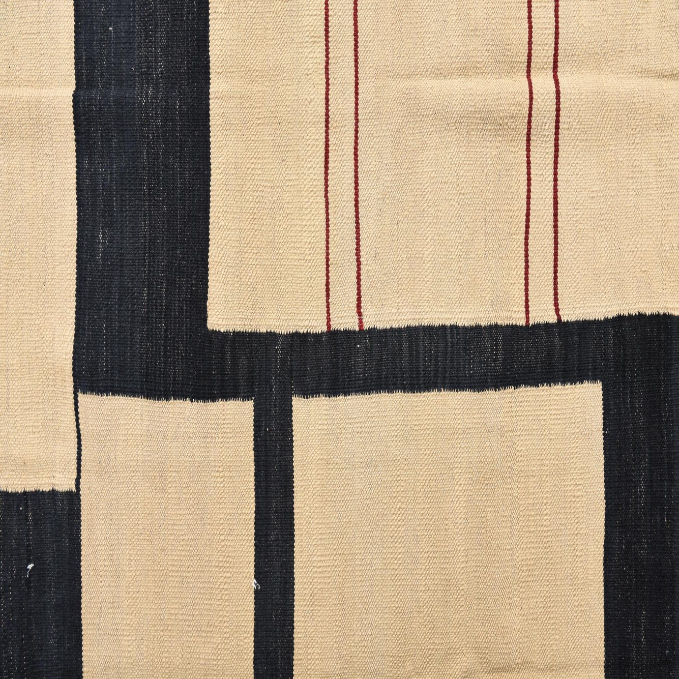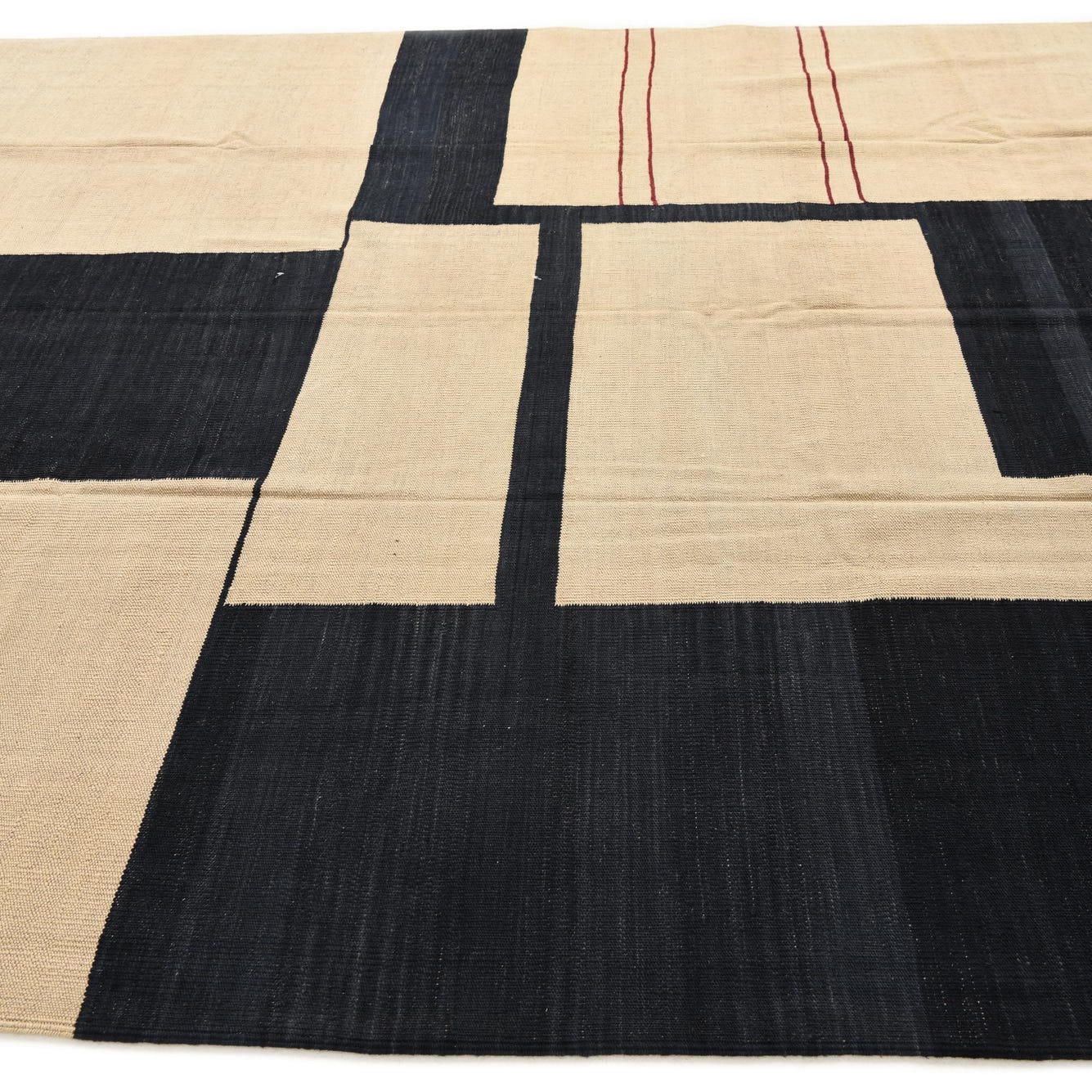 An 8x10 rectangular flatweave rug featuring a modern tribal pattern with large blocks of black and cream, accented by thin red lines.