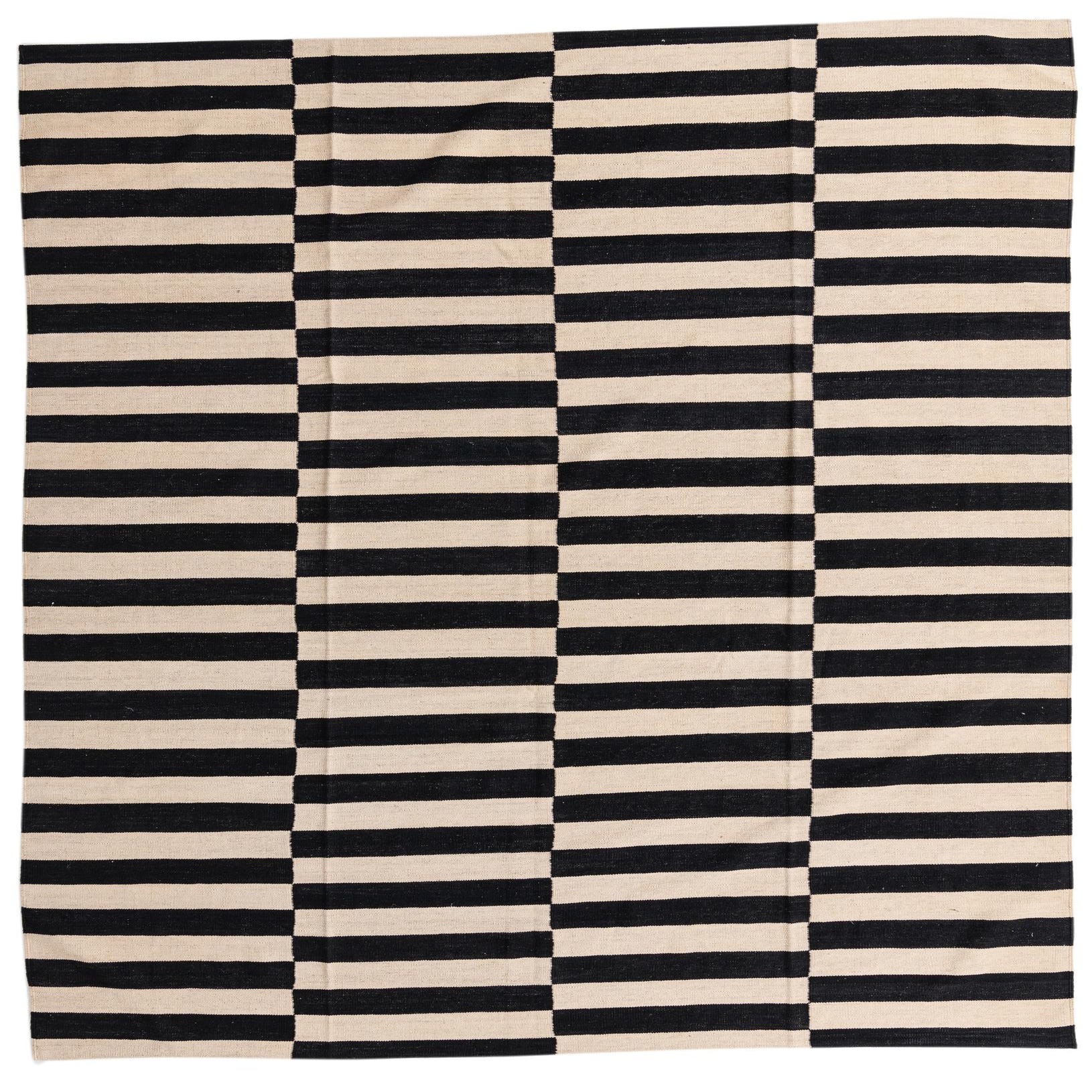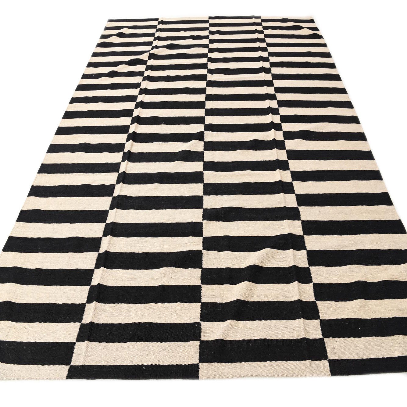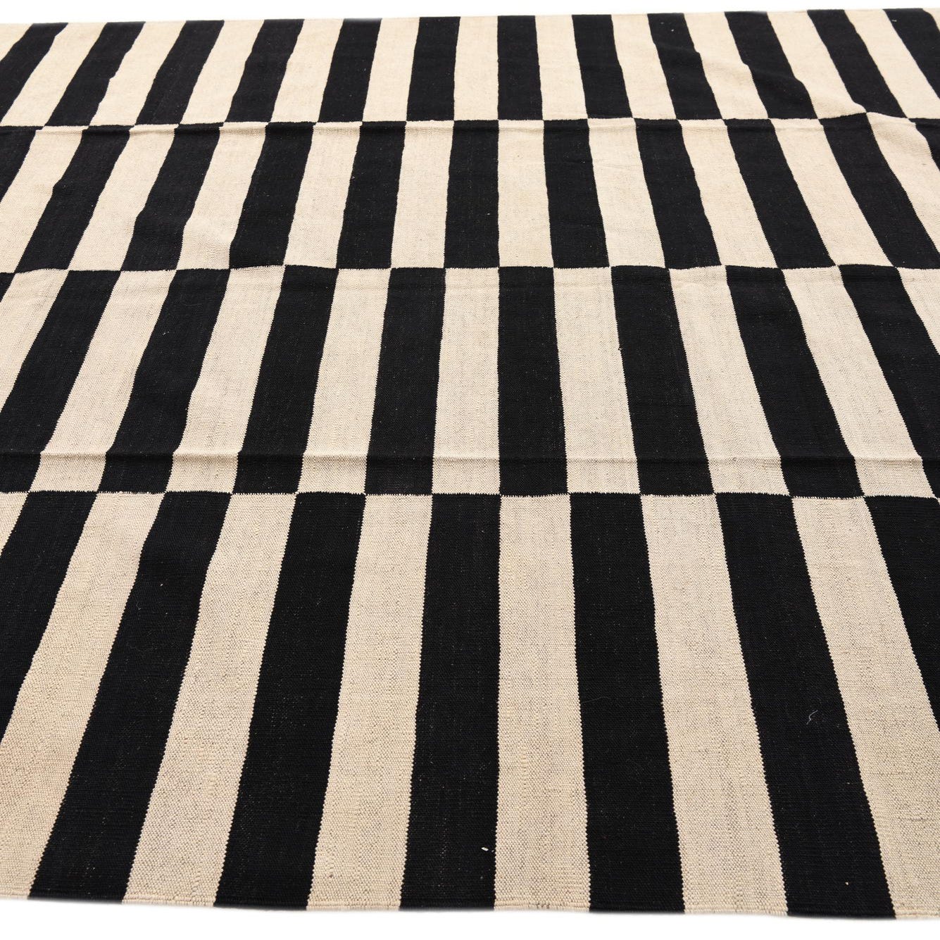 The Kilim Modern collection presents this hand-woven 8x10 rug crafted from 100% wool, offering durability alongside its tactile comfort. Featuring a bold, graphic design of black and white stripes, this rug boasts a crisp, timeless look that can serve as a striking focal point in a variety of settings. The flatweave construction adds to its contemporary appeal, making it an excellent choice for those seeking a modern aesthetic without compromising on the warmth and texture that wool provides.