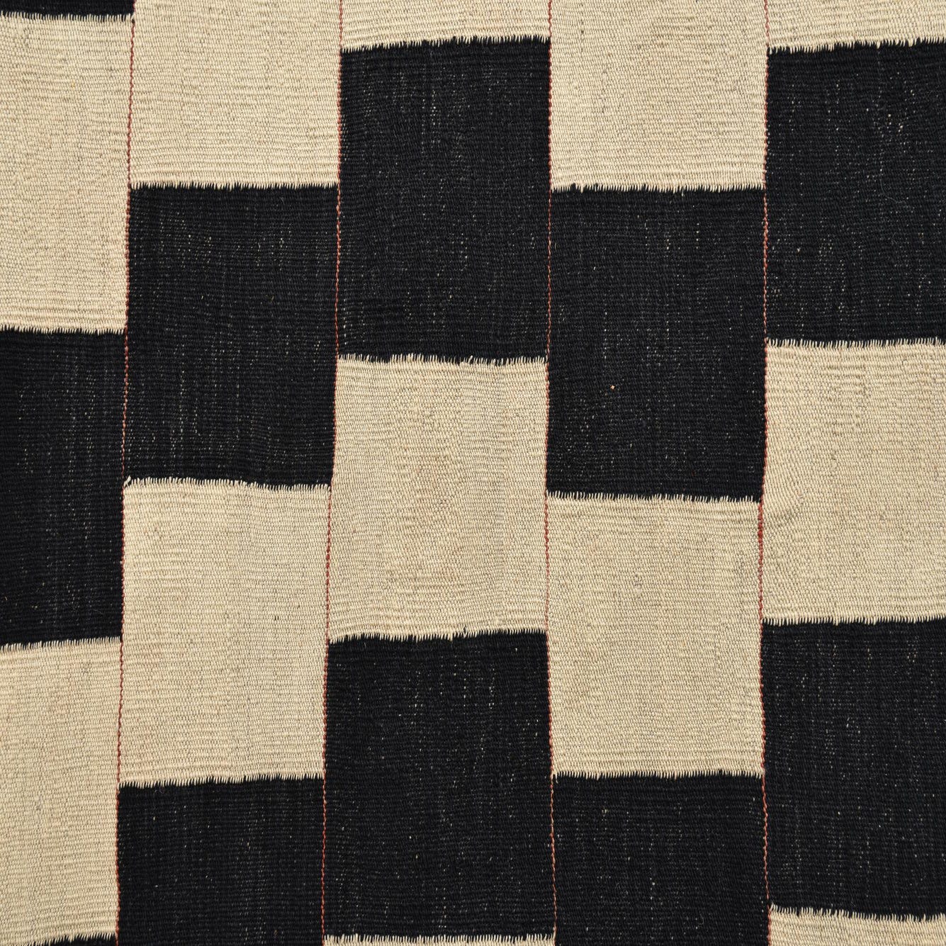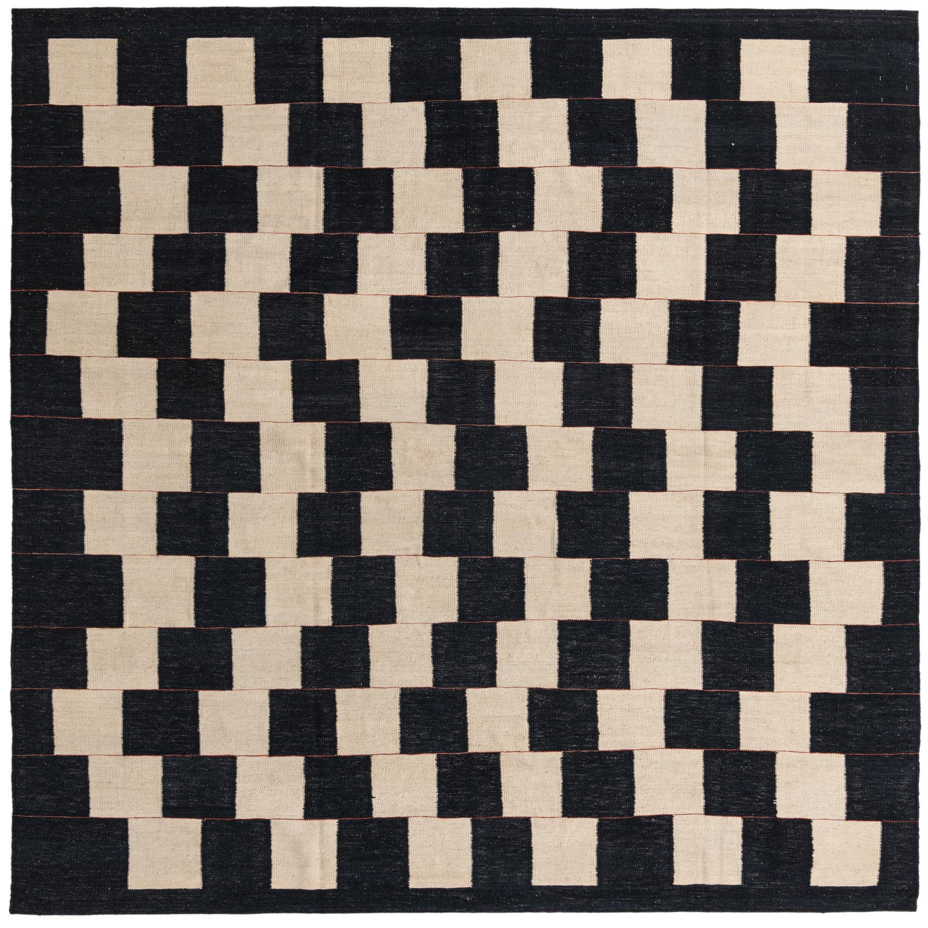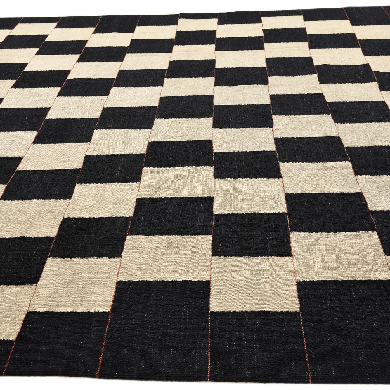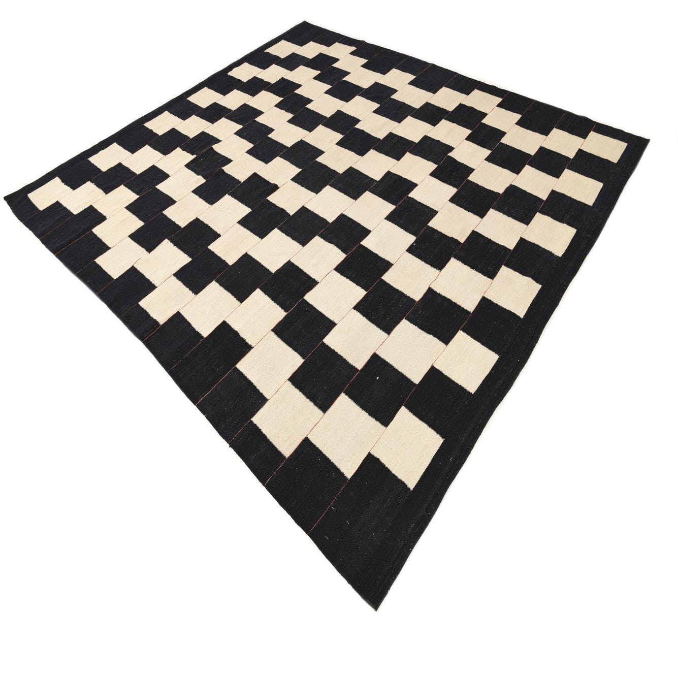 The Kilim Modern 8x10 rug is a visually striking piece, hand-woven from 100% wool, ensuring both durability and a comfortable texture underfoot. This rug features a compelling geometric pattern, composed of a series of black and white blocks arranged in a staggered formation, creating an impression of depth and movement. Accent lines of red subtly frame the design, adding a dimension of color that enhances the visual appeal.