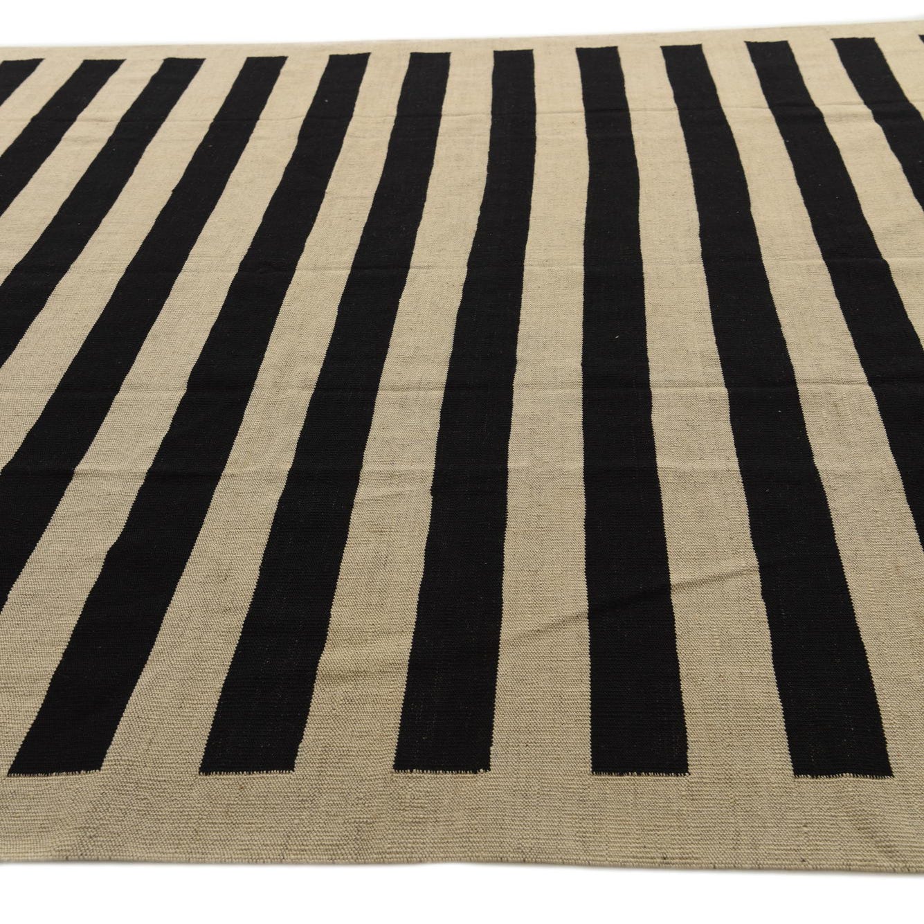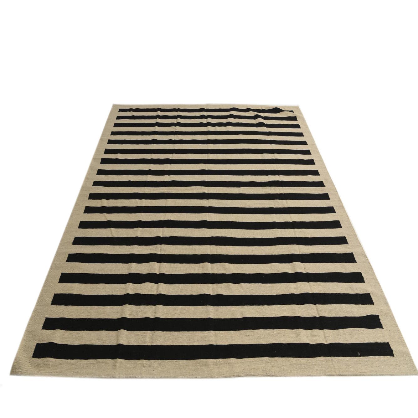 A rectangular 8x10 Kilim Modern wool rug featuring bold black and cream horizontal stripes, suitable for a living room.