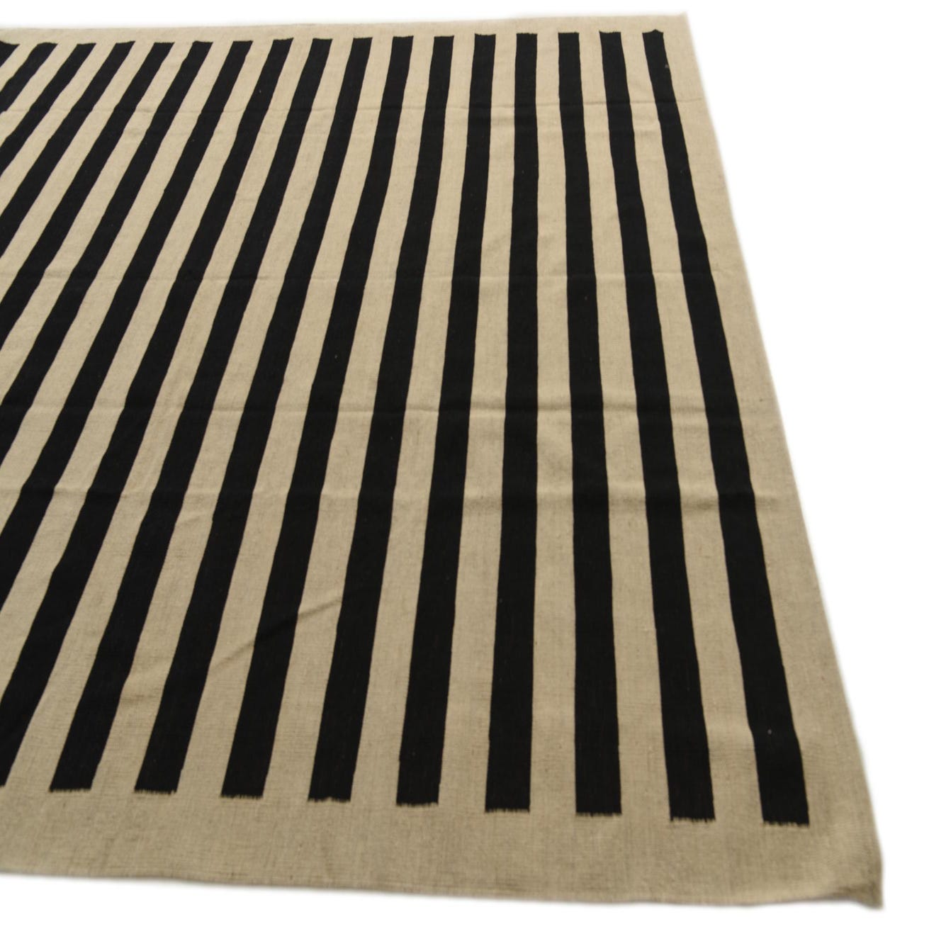 This Kilim Modern rug, sized at 8x10 feet, features a bold and graphic striped pattern that creates a striking visual impact. These clean lines in contrasting black and white deliver a sharp and timeless design. The hand-woven construction of 100% wool ensures a tactile texture and affirms its durability.