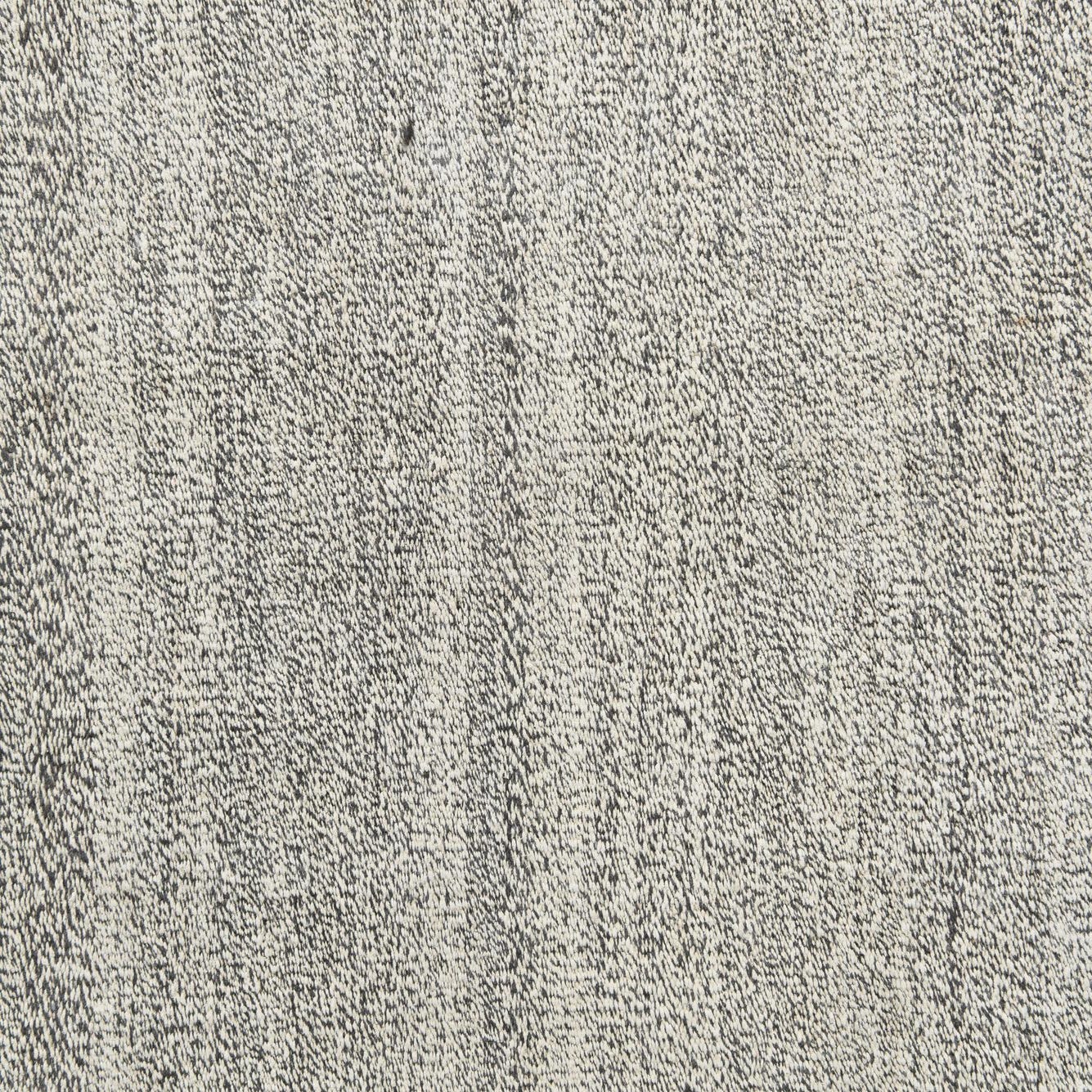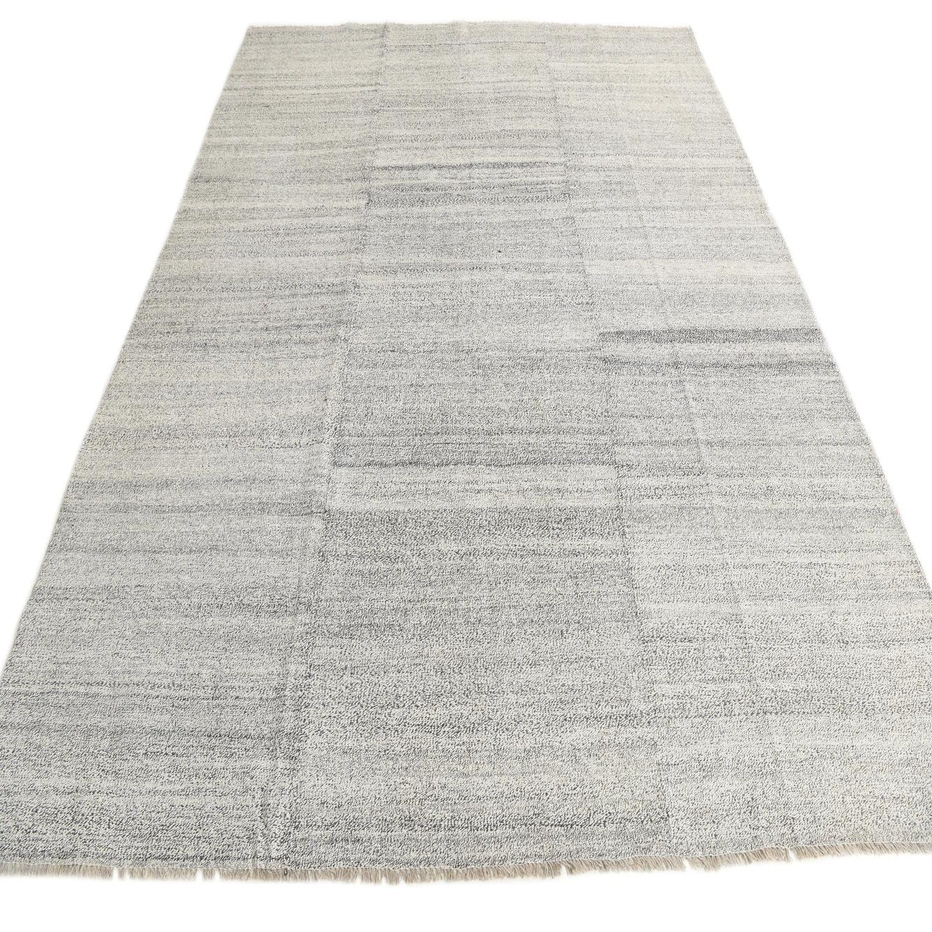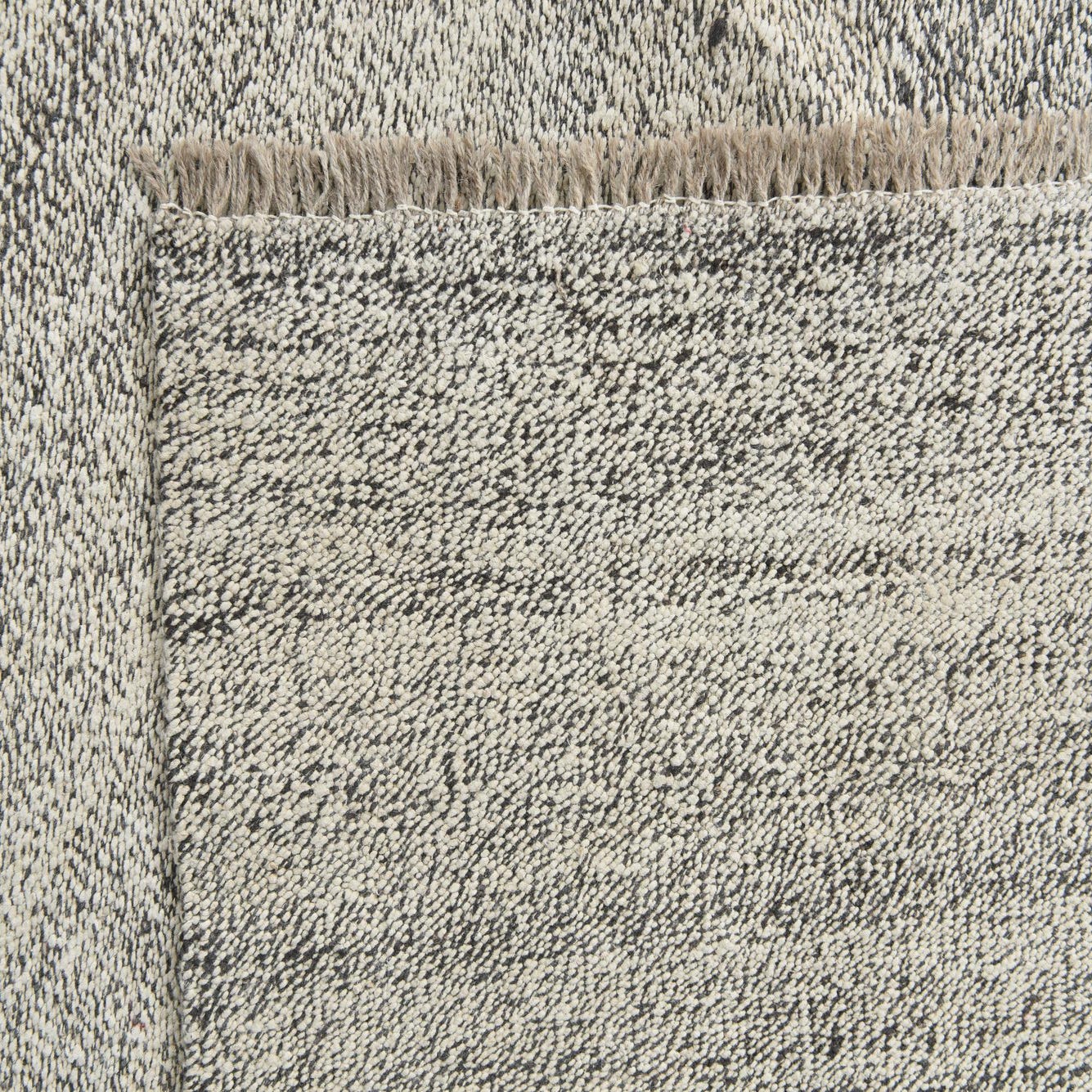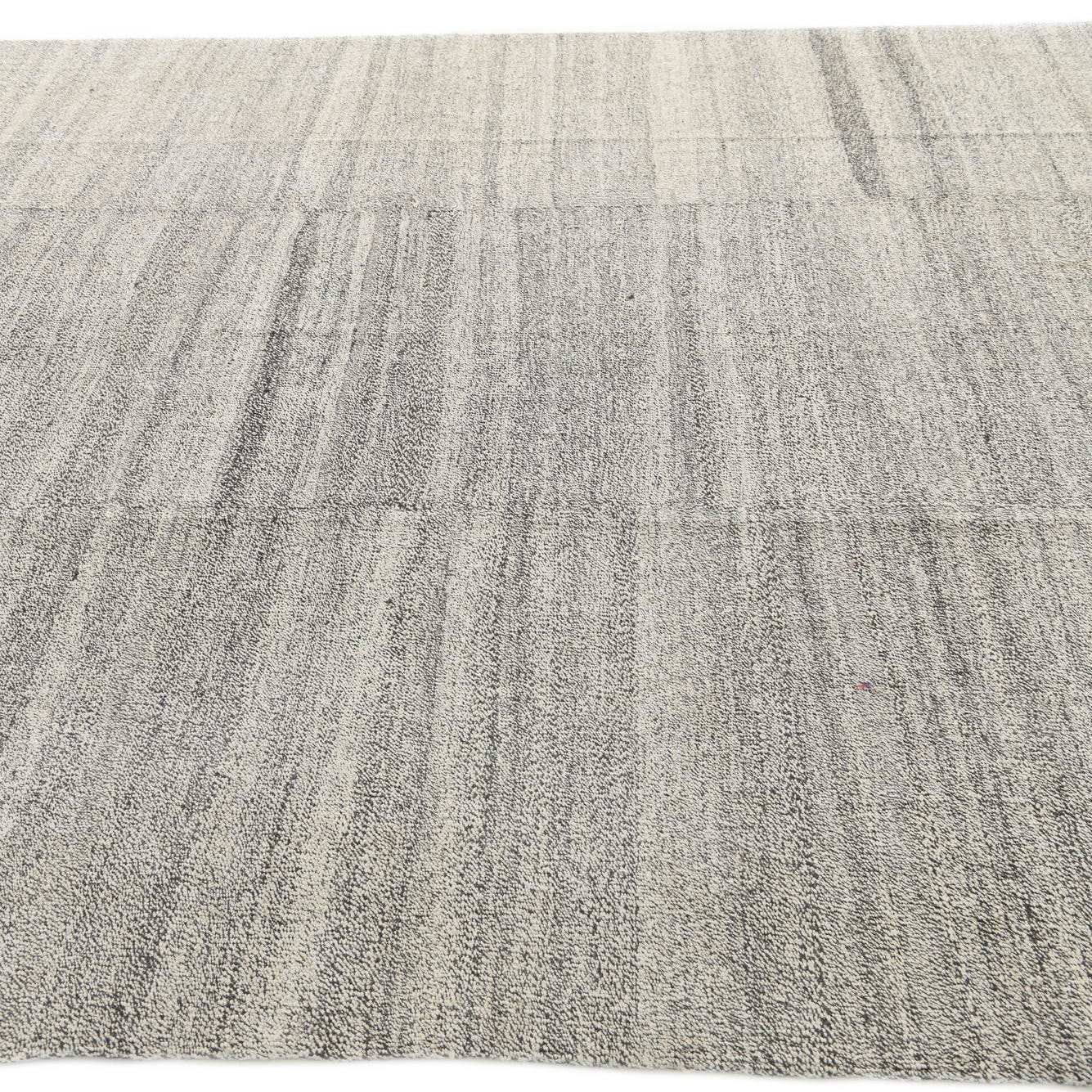 An 8x10 rectangular flatweave wool rug featuring a modern tribal pattern in shades of black, white, and ivory.