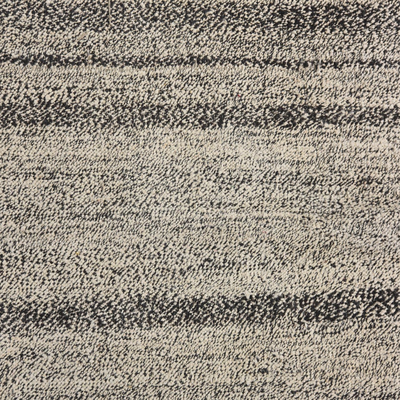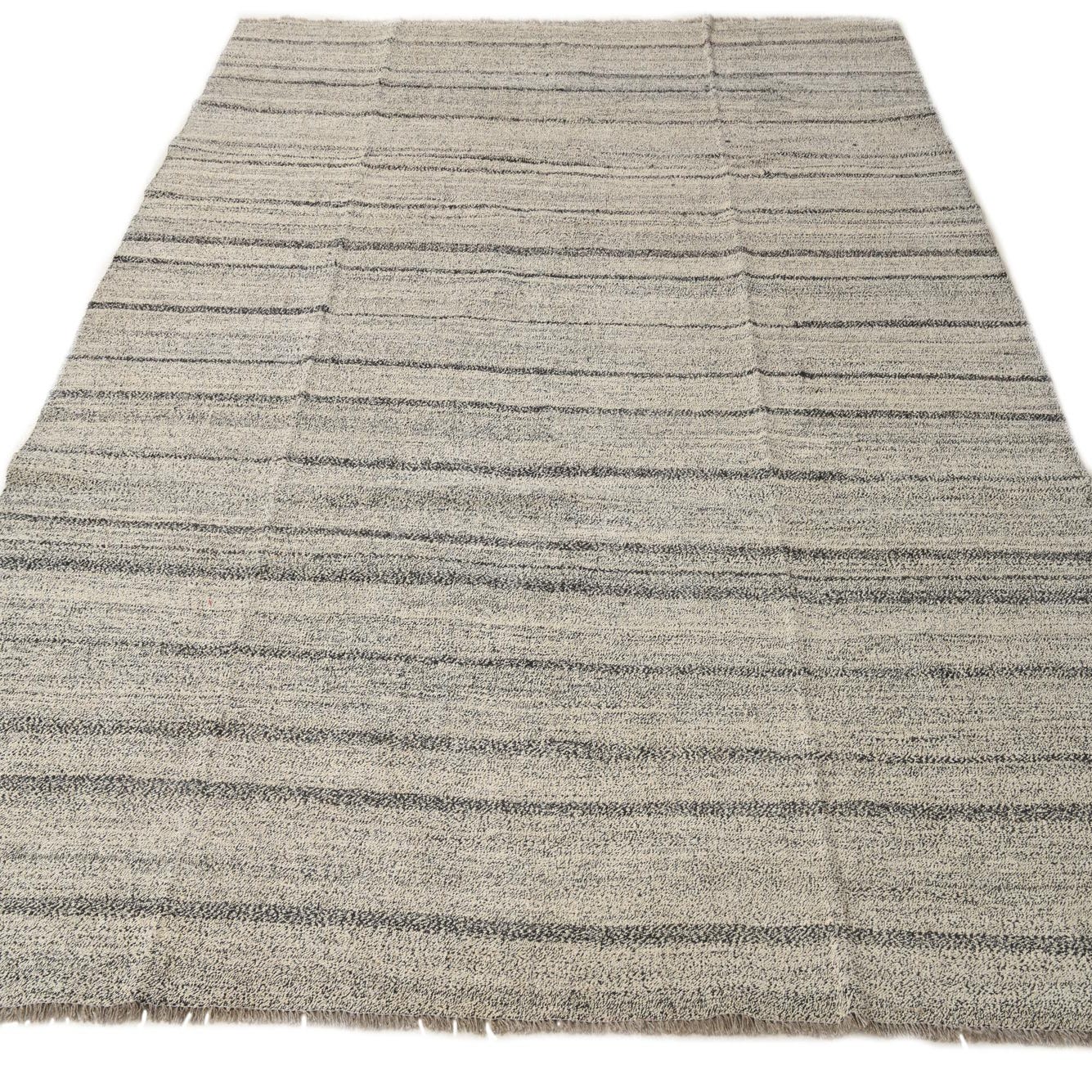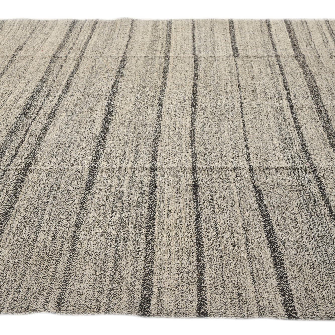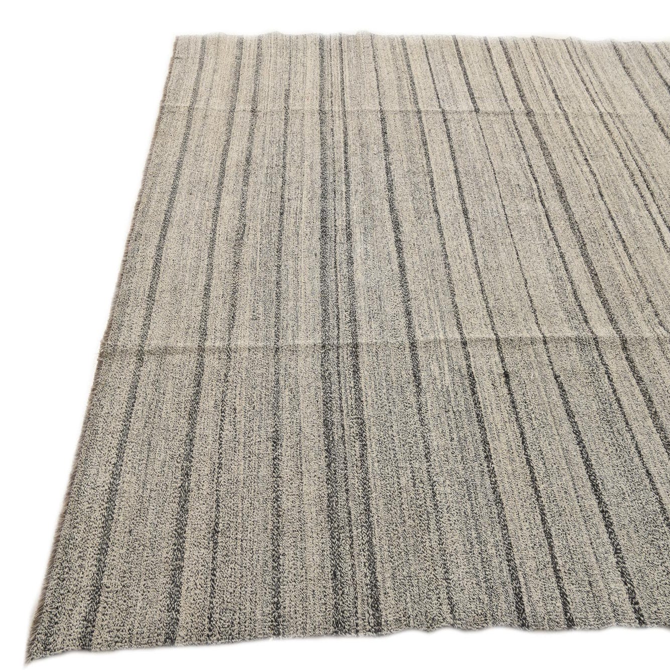 An 8x10 rectangular flatweave wool rug featuring thin horizontal stripes in varying shades of black, white, and cream.