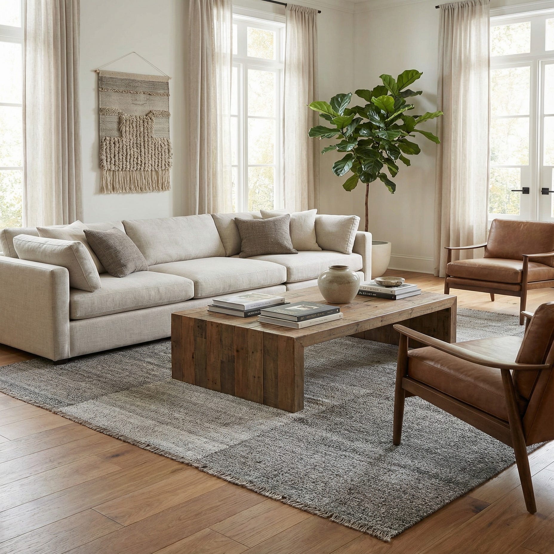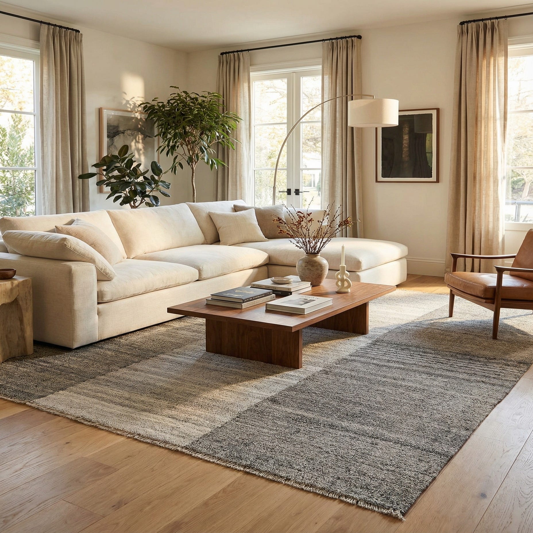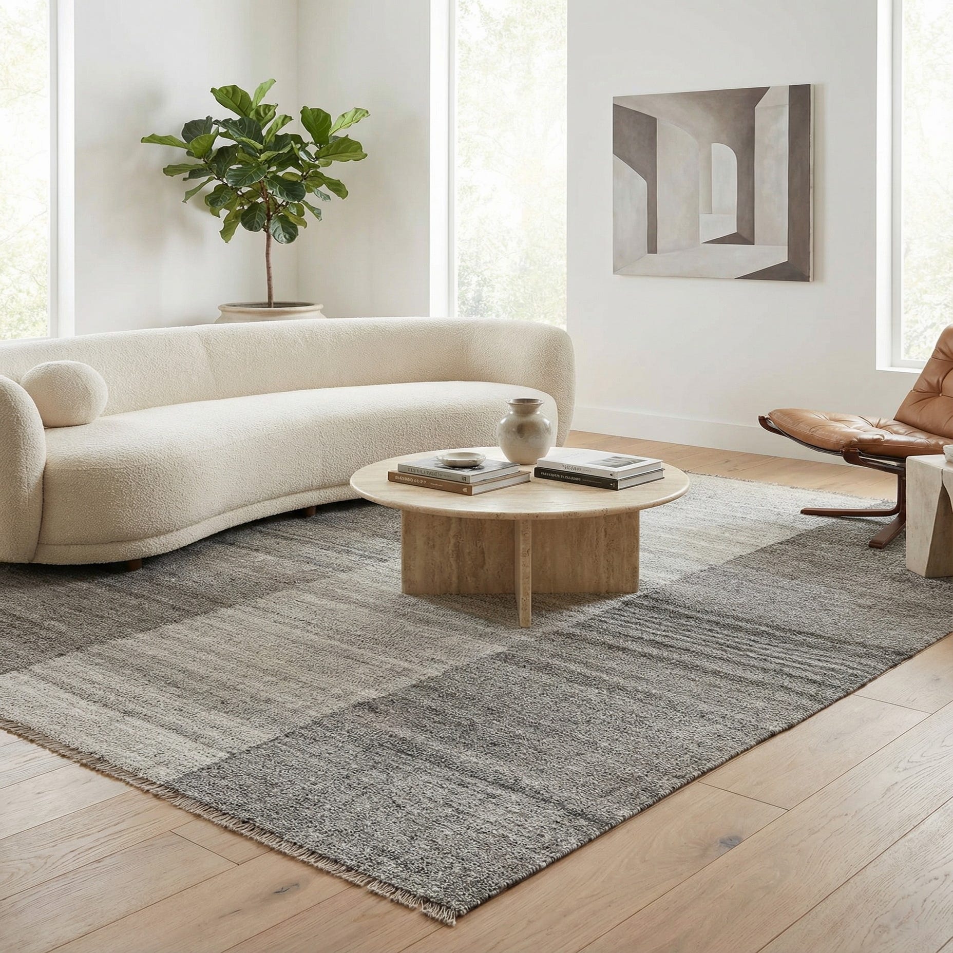 This rug would be particularly well-suited to minimalist or modern decors, where its clean lines and contrasting colors would complement sleek furniture and create a strong visual anchor for the space. In a more eclectic setting, it could serve as a grounding element amongst more vibrant colors and patterns. The Kilim Modern rug is a versatile choice that could harmonize with both stark and warm interiors, making it an adaptive addition to any home or office space.
