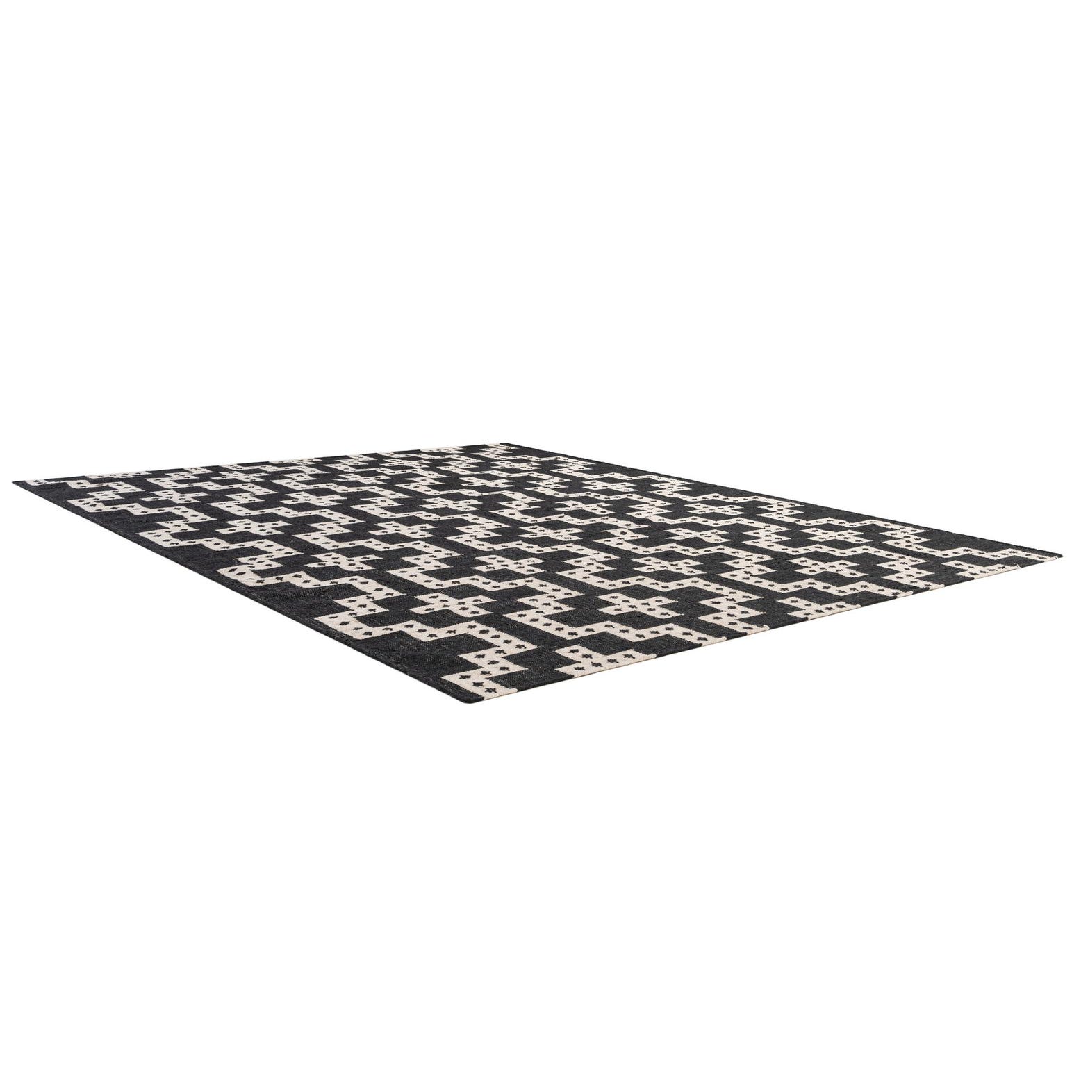 Hand-woven from 100% wool in a flatweave construction, this rug has a firm, low-profile surface with a tactile, tightly woven hand. A bold geometric layout of stepped crosses and blocky plus motifs repeats across a deep black ground in crisp white, the pattern accented with small dotted details that give it a handcrafted character. The high-contrast palette and visible weave create clear graphic definition while the wool adds a subtle warmth and natural texture underfoot.