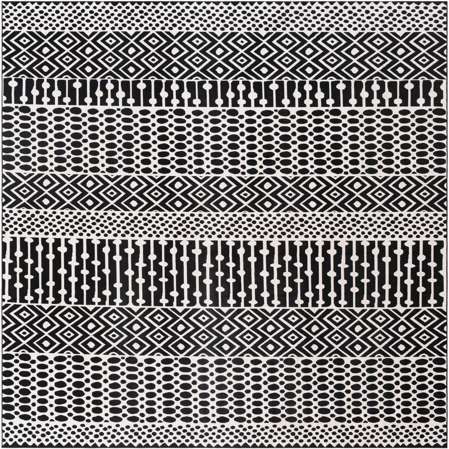Machine-made from 100% polyester, the surface feels smooth and slightly plush underfoot with a low pile that preserves crisp pattern edges. Layer it under a sofa to anchor a monochrome living room, use it to define a minimalist dining area with light wood furniture, or place it in a home office to add graphic interest against neutral walls. It also pairs well with leather seating, metal accents, or a single saturated color accent (mustard, teal, or deep red) for a lively focal point.