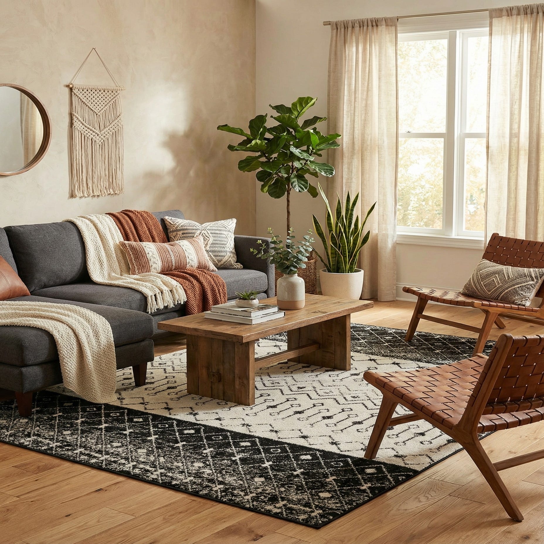 This rug fits well in a variety of interiors: pair it with clean-lined furniture and warm wood tones for a Scandinavian or modern farmhouse living room, layer it beneath a glass-top dining table to anchor a monochrome dining space, or use it to introduce contrast in a neutral bedroom. It also works as a grounding element in a contemporary loft or a minimalist entryway where the bold pattern provides visual interest without overwhelming the room.