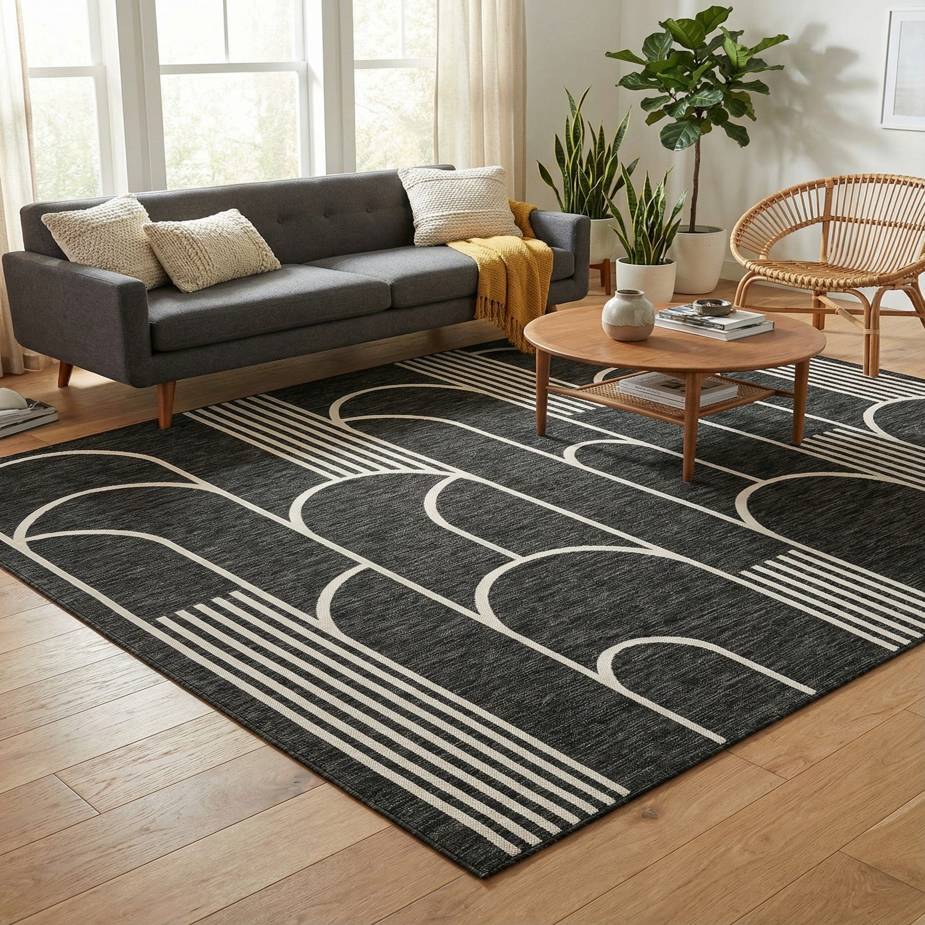 An 8x10 black and white contemporary outdoor rug with a bold geometric pattern of curved and straight lines.