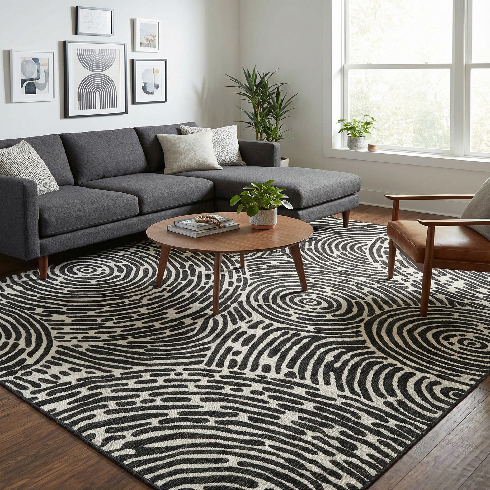 A rectangular 8x10 black and white modern abstract rug with a fingerprint-like pattern, suitable for indoor or outdoor use.