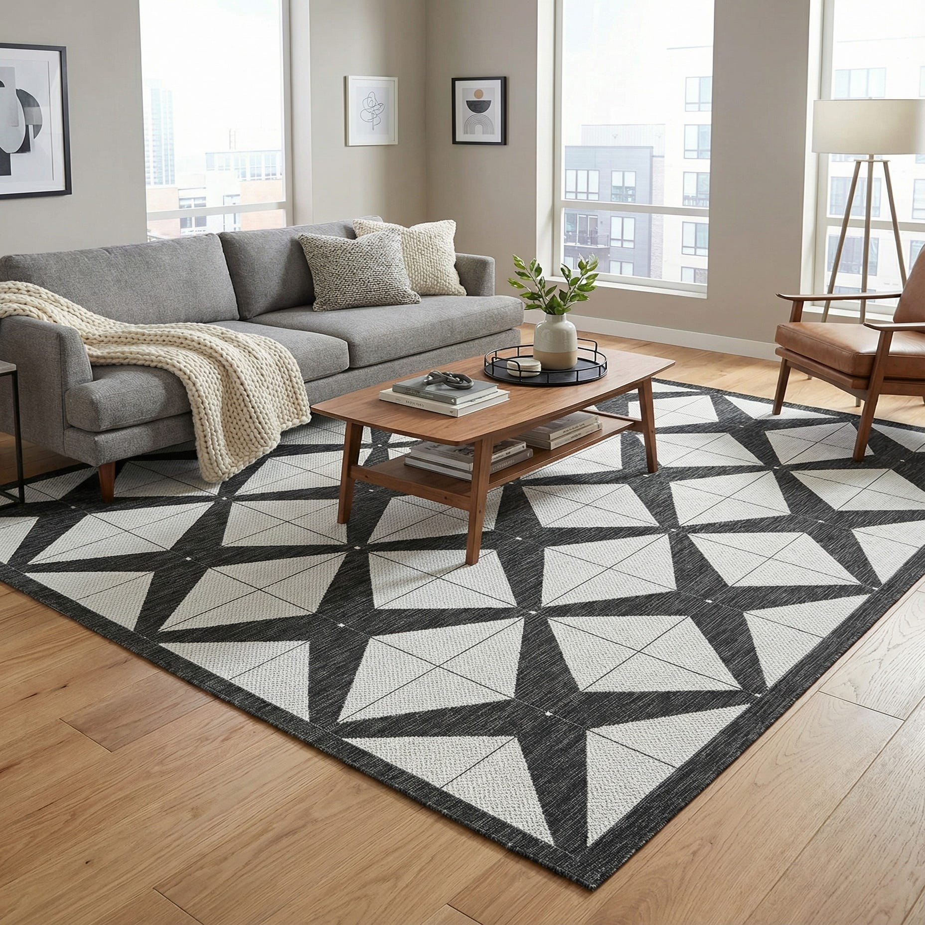 This area rug is well-suited for outdoor patios, garden spaces, and poolside areas, where its graphic design can complement modern outdoor furniture and decor. It can also transition well into indoor settings such as sunrooms or casual living spaces that demand easy-to-clean surfaces and a sharp, contemporary aesthetic.