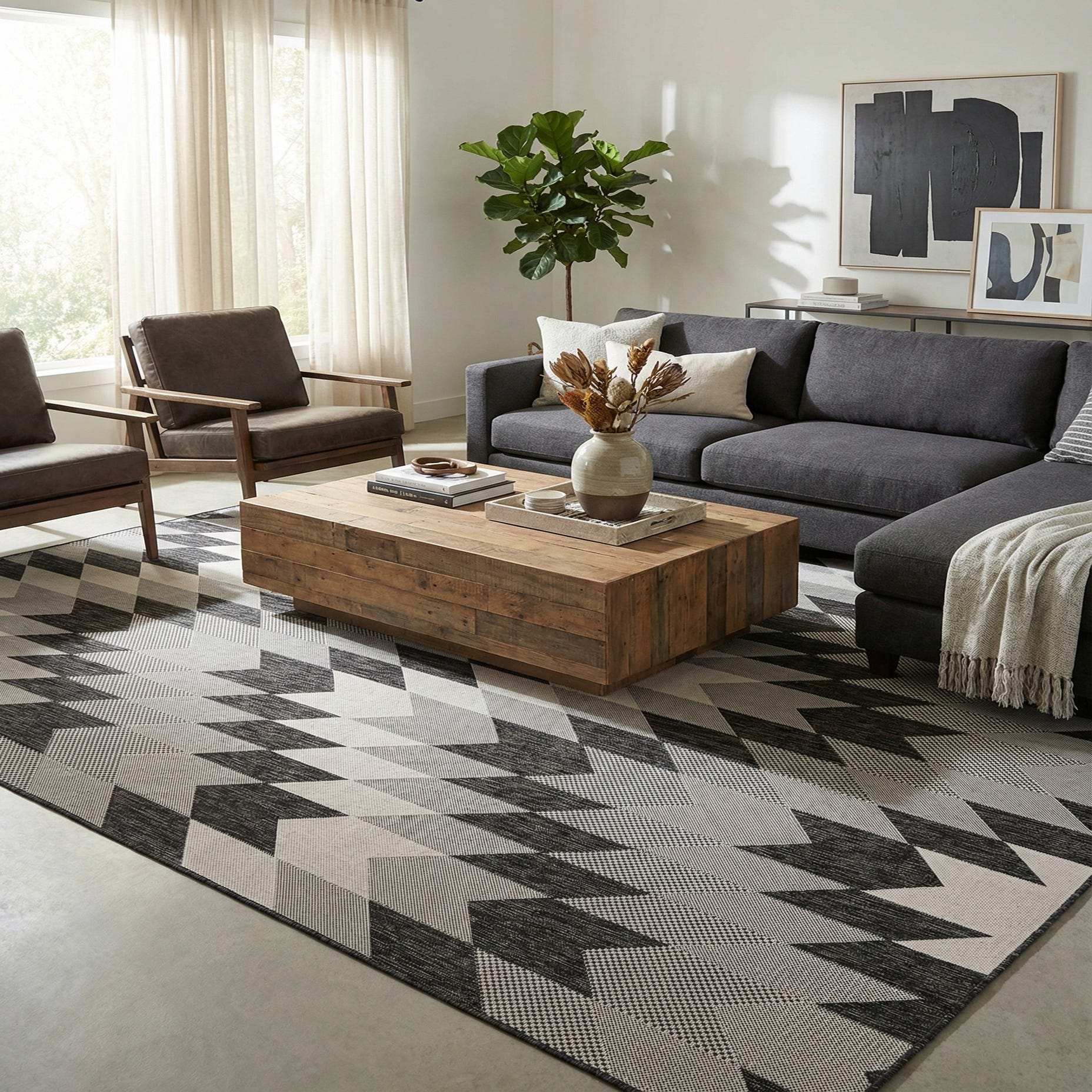 A rectangular 8x10 black and white flatweave rug with a modern tribal geometric pattern, suitable for indoor or outdoor use.