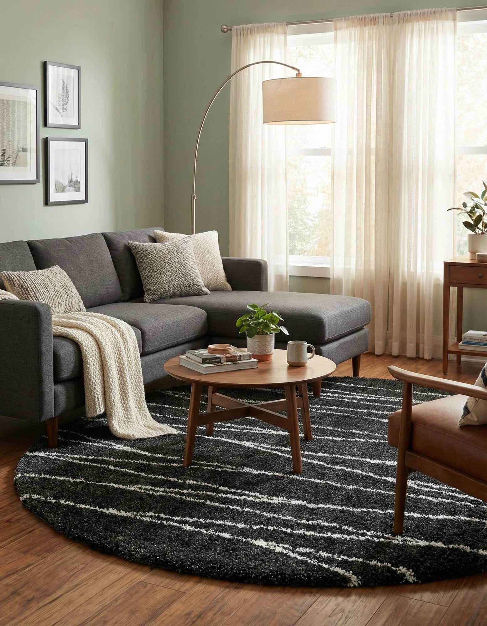 An oval black shag rug with a modern white abstract stripe pattern, suitable for a living room.