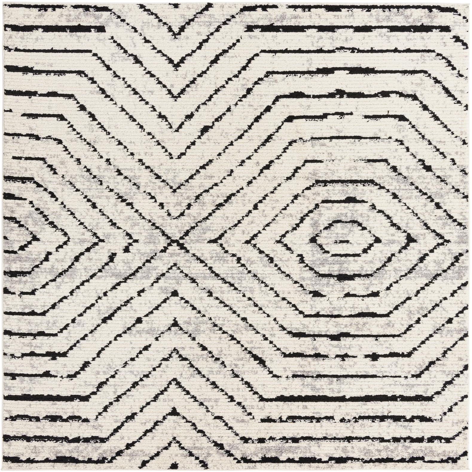 Primary color is Black and White. Colors in this rug include: Black and White, Gray.