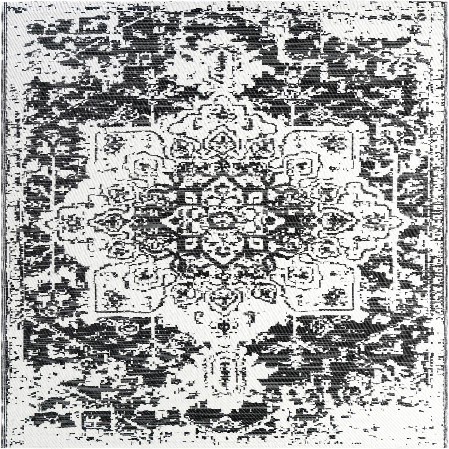 This piece works well on covered patios, sunrooms, or contemporary living areas where a strong monochrome anchor is needed. Place it beneath a patio dining set to ground outdoor gatherings, layer it under a streamlined sofa in a modern living room, or use it in an entryway to make a graphic statement. Pair with warm wood tones, metal accents, or natural fibers to balance the bold black-and-white contrast and create a cohesive, collected look.
